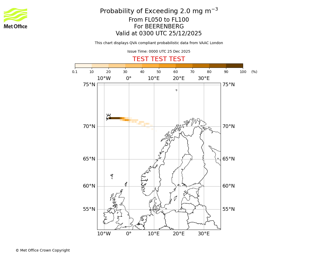 Probability of exceeding 2.0 milligrams per metre cubed. From 000 to 050 for BEERENBERG. Valid at 0300 UTC 25/12/2025