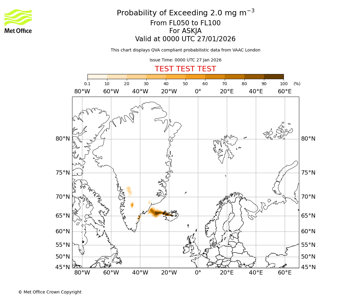 Probability of exceeding 2.0 milligrams per metre cubed. From 000 to 050 for ASKJA. Valid at 0000 UTC 27/01/2026