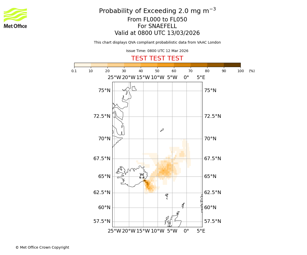 Modelled ash concentration from 000 to 050 for SNAEFELL. Valid at 0800 UTC 12/03/2026