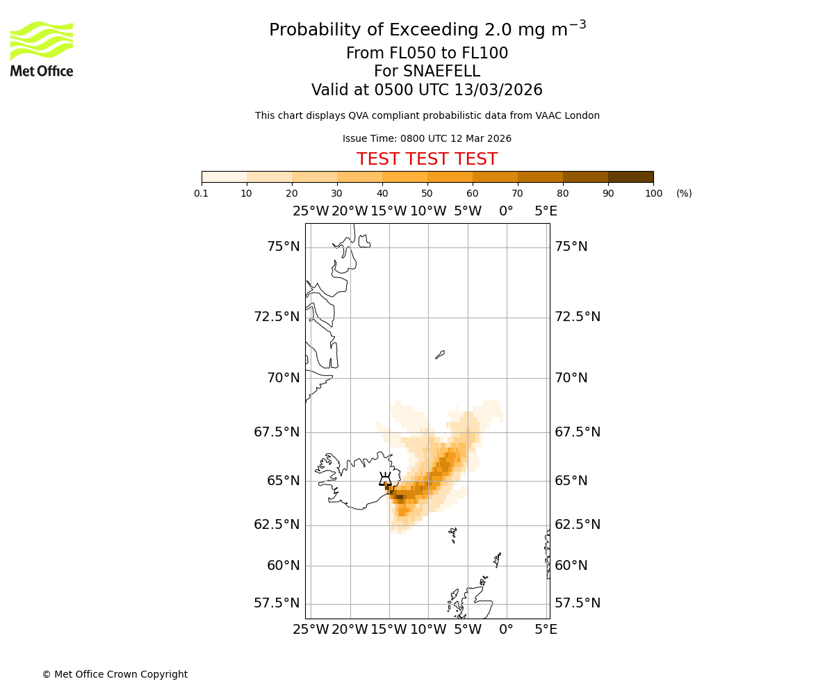 Probability of exceeding 2.0 milligrams per metre cubed. From 000 to 050 for SNAEFELL. Valid at 0500 UTC 13/03/2026