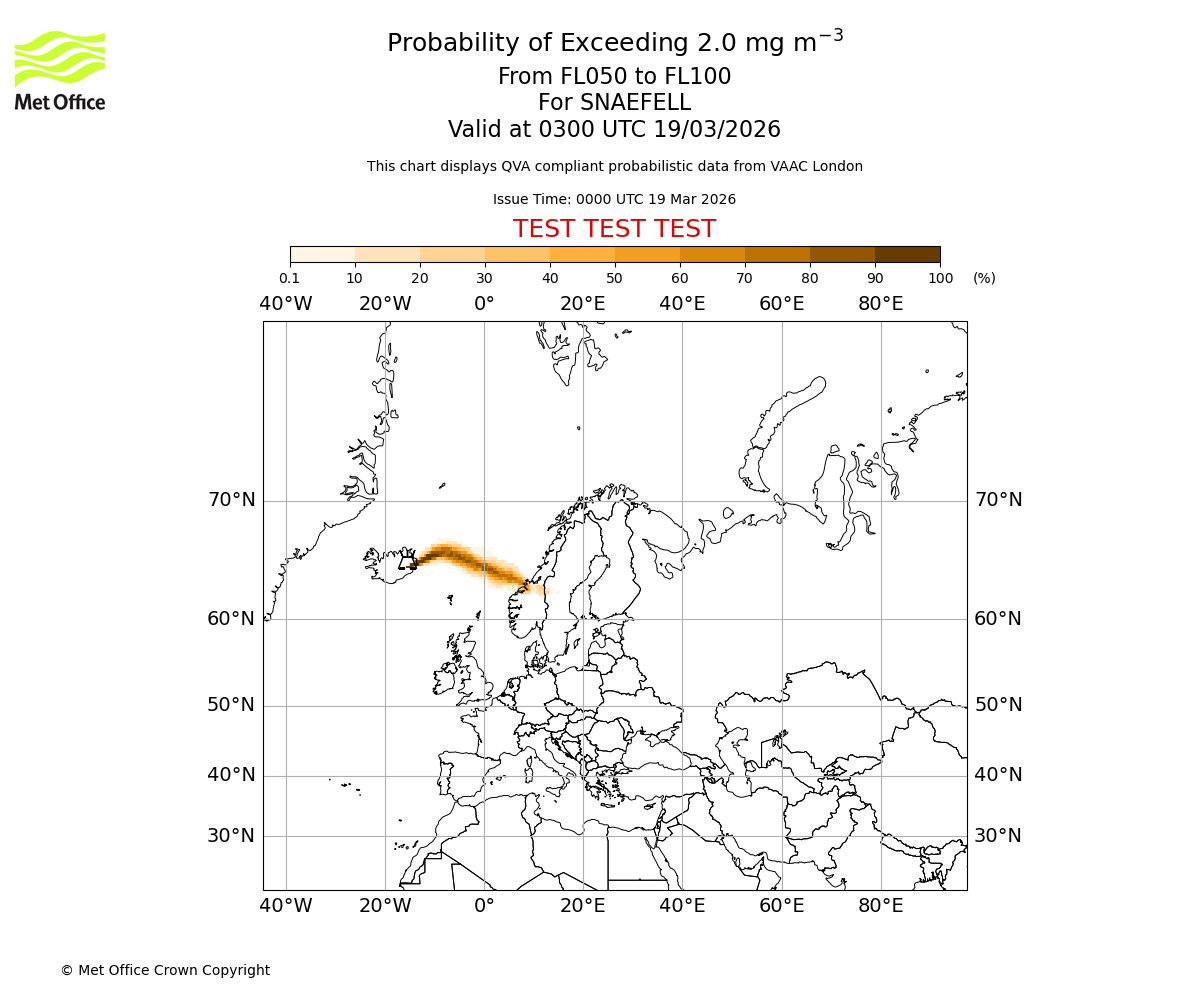 Quantitative Volcanic Ash charts (QVA) are produced in accordance with International Civil Aviation Organization (ICAO) Annex 3 requirements and are provided as well as the London Volcanic Ash Advisory Graphics (VAG) and Advisories (VAA). The lowest QVA threshold (0.2 mg/m³) matches to the areas depicted in the VAA and VAG. Both expected ash concentration and probabilistic forecast information is provided in the chart viewer below for eruptions occurring in the London Volcanic Ash Advisory Centre (VAAC) area of responsibility.