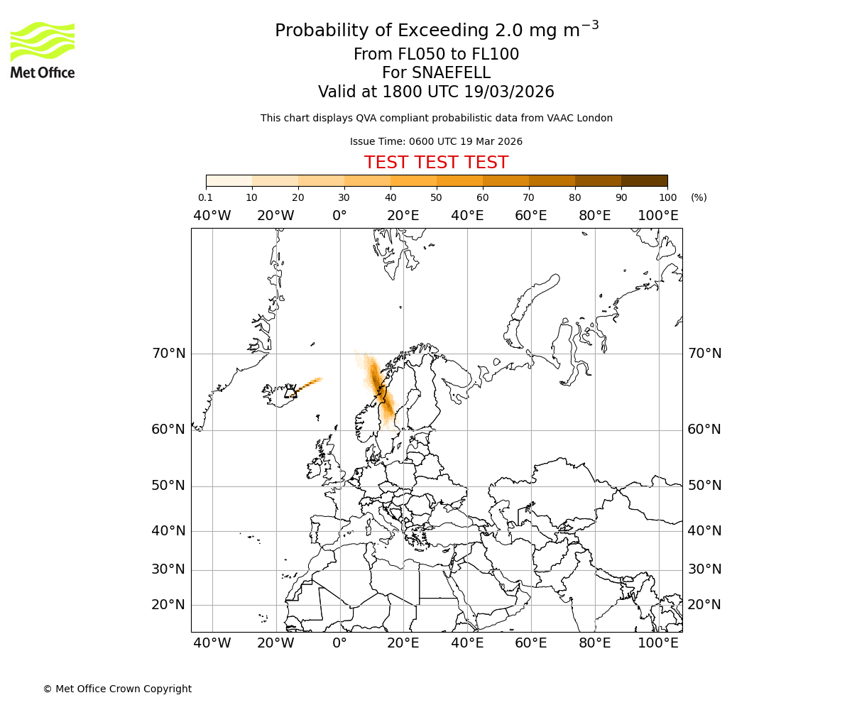 Quantitative Volcanic Ash charts (QVA) are produced in accordance with International Civil Aviation Organization (ICAO) Annex 3 requirements and are provided as well as the London Volcanic Ash Advisory Graphics (VAG) and Advisories (VAA). The lowest QVA threshold (0.2 mg/m³) matches to the areas depicted in the VAA and VAG. Both expected ash concentration and probabilistic forecast information is provided in the chart viewer below for eruptions occurring in the London Volcanic Ash Advisory Centre (VAAC) area of responsibility.