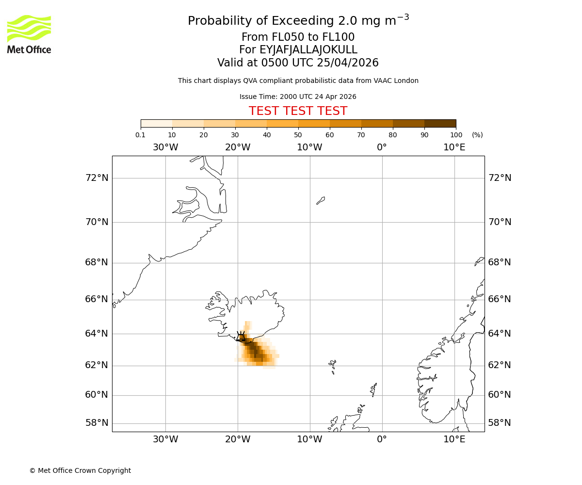 Probability of exceeding 2.0 milligrams per metre cubed. From 000 to 050 for EYJAFJALLAJOKULL. Valid at 0500 UTC 25/04/2026
