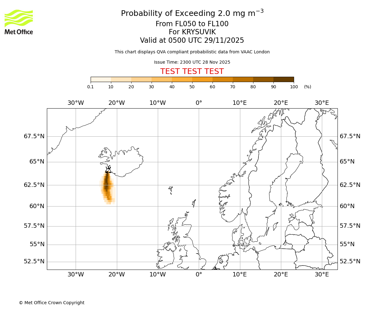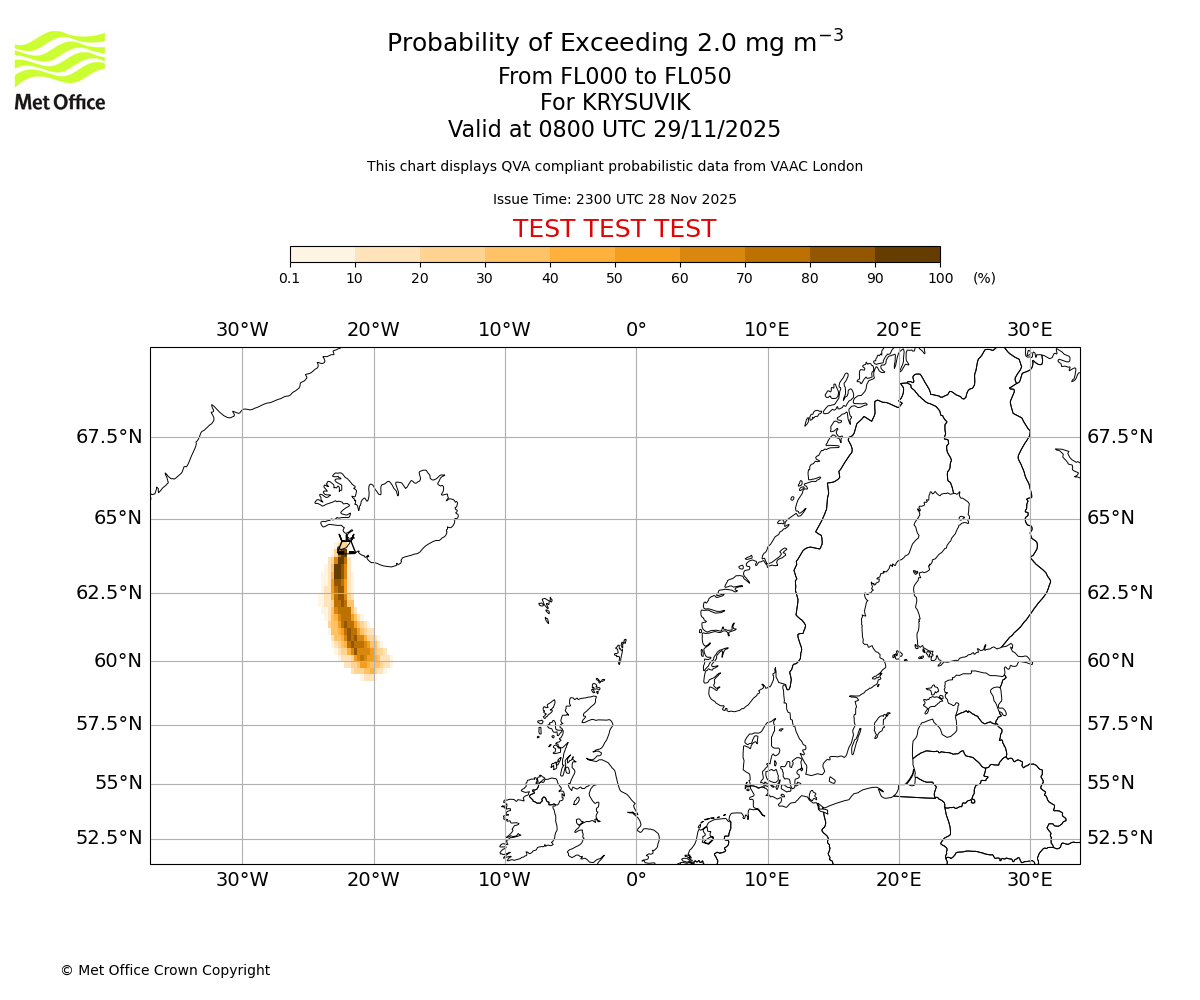 Quantitative Volcanic Ash charts (QVA) are produced in accordance with International Civil Aviation Organization (ICAO) Annex 3 requirements and are provided as well as the London Volcanic Ash Advisory Graphics (VAG) and Advisories (VAA). The lowest QVA threshold (0.2 mg/m³) matches to the areas depicted in the VAA and VAG. Both expected ash concentration and probabilistic forecast information is provided in the chart viewer below for eruptions occurring in the London Volcanic Ash Advisory Centre (VAAC) area of responsibility.