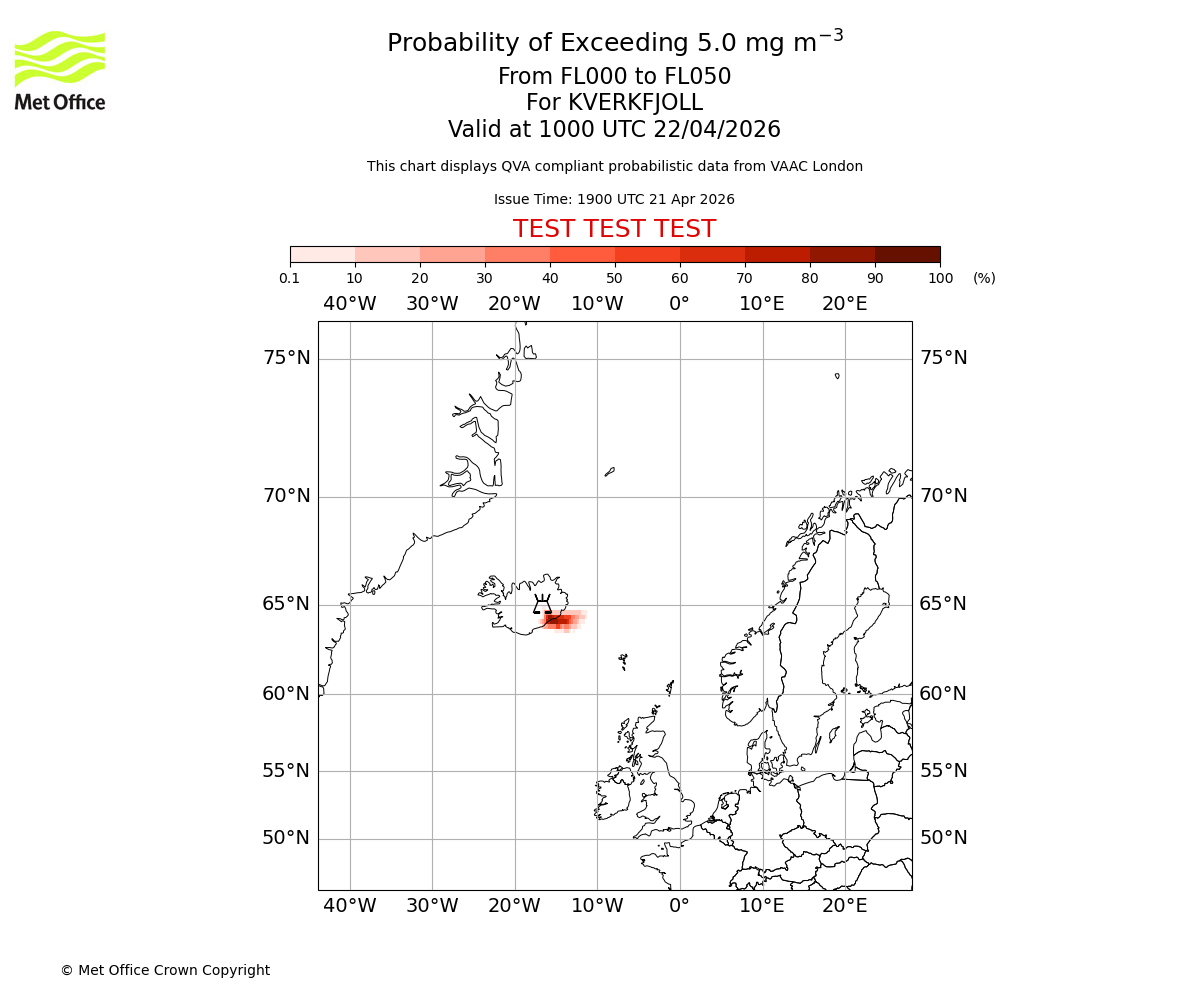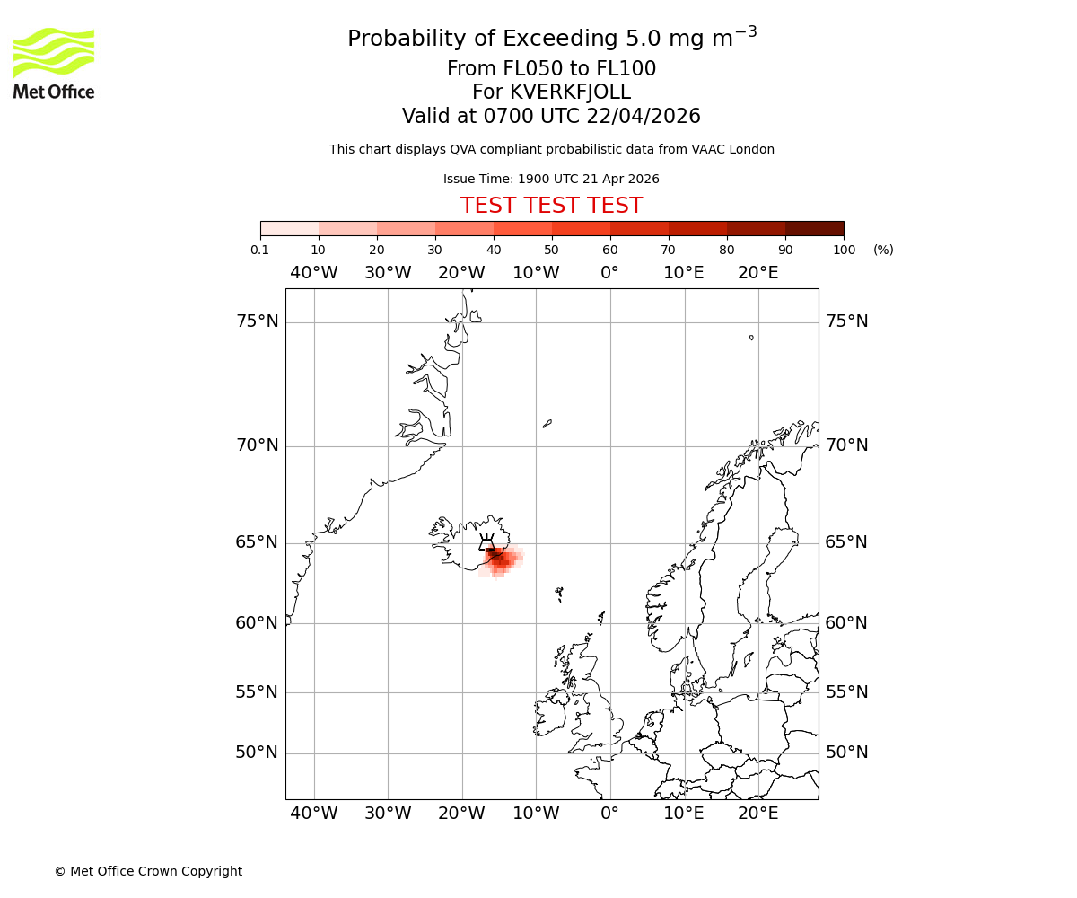 Probability of exceeding 5.0 milligrams per metre cubed. From 000 to 050 for KVERKFJOLL. Valid at 0700 UTC 22/04/2026