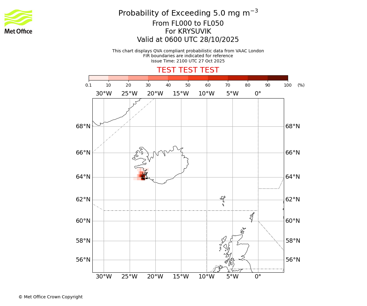 Probability of exceeding 5.0 milligrams per metre cubed. From 000 to 050 for KRYSUVIK. Valid at 0300 UTC 28/10/2025