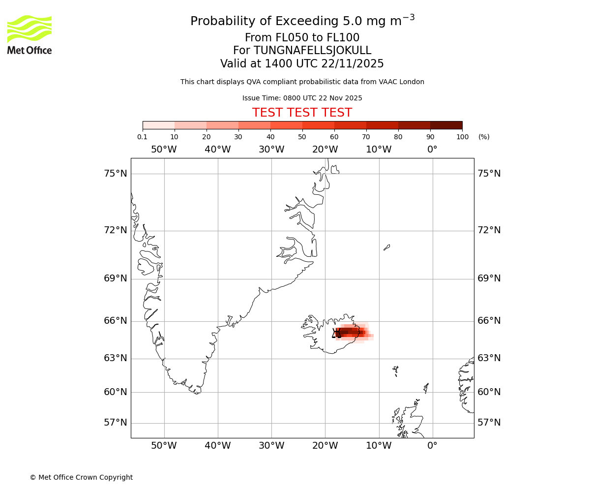 Probability of exceeding 5.0 milligrams per metre cubed. From 000 to 050 for TUNGNAFELLSJOKULL. Valid at 1400 UTC 22/11/2025