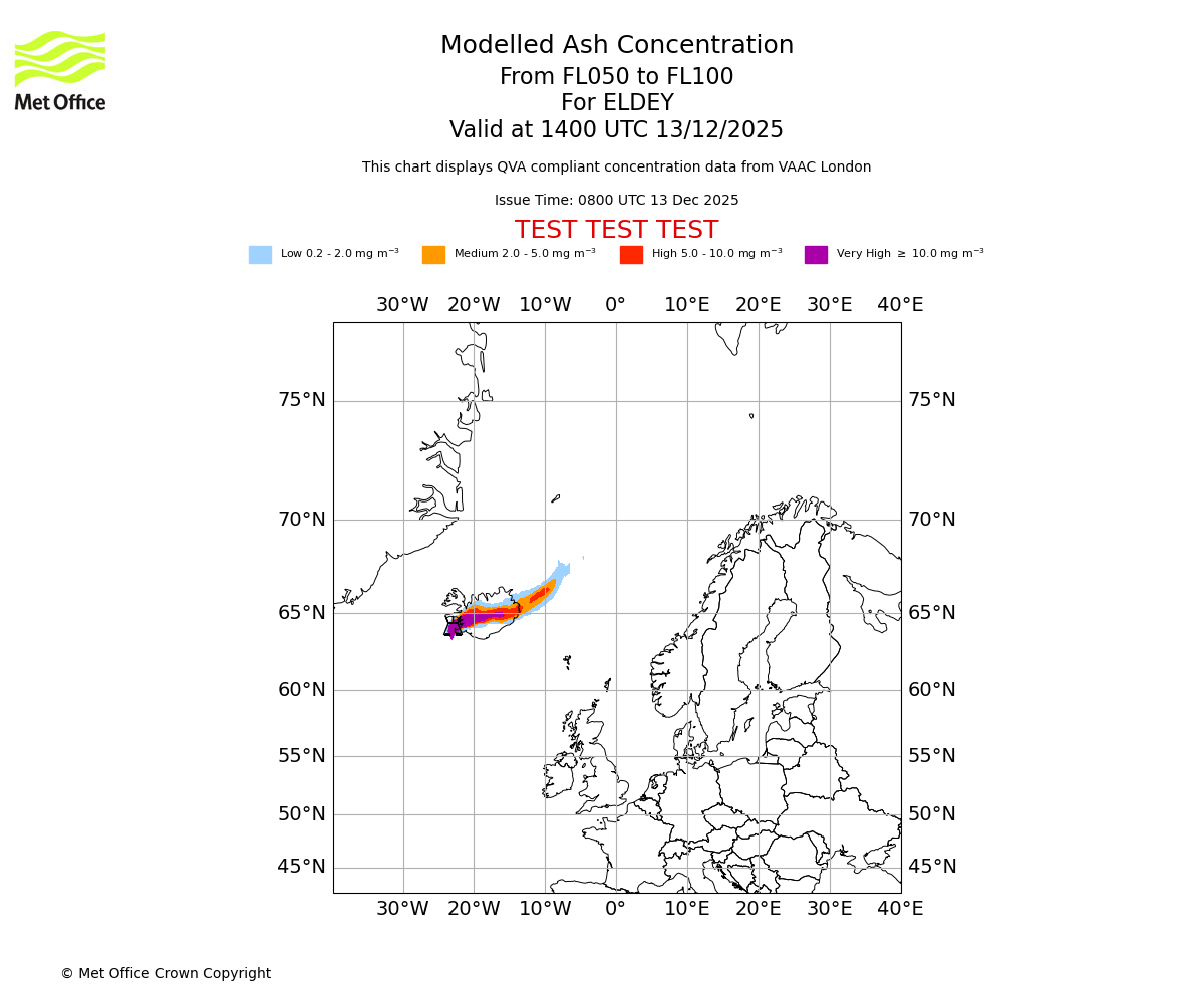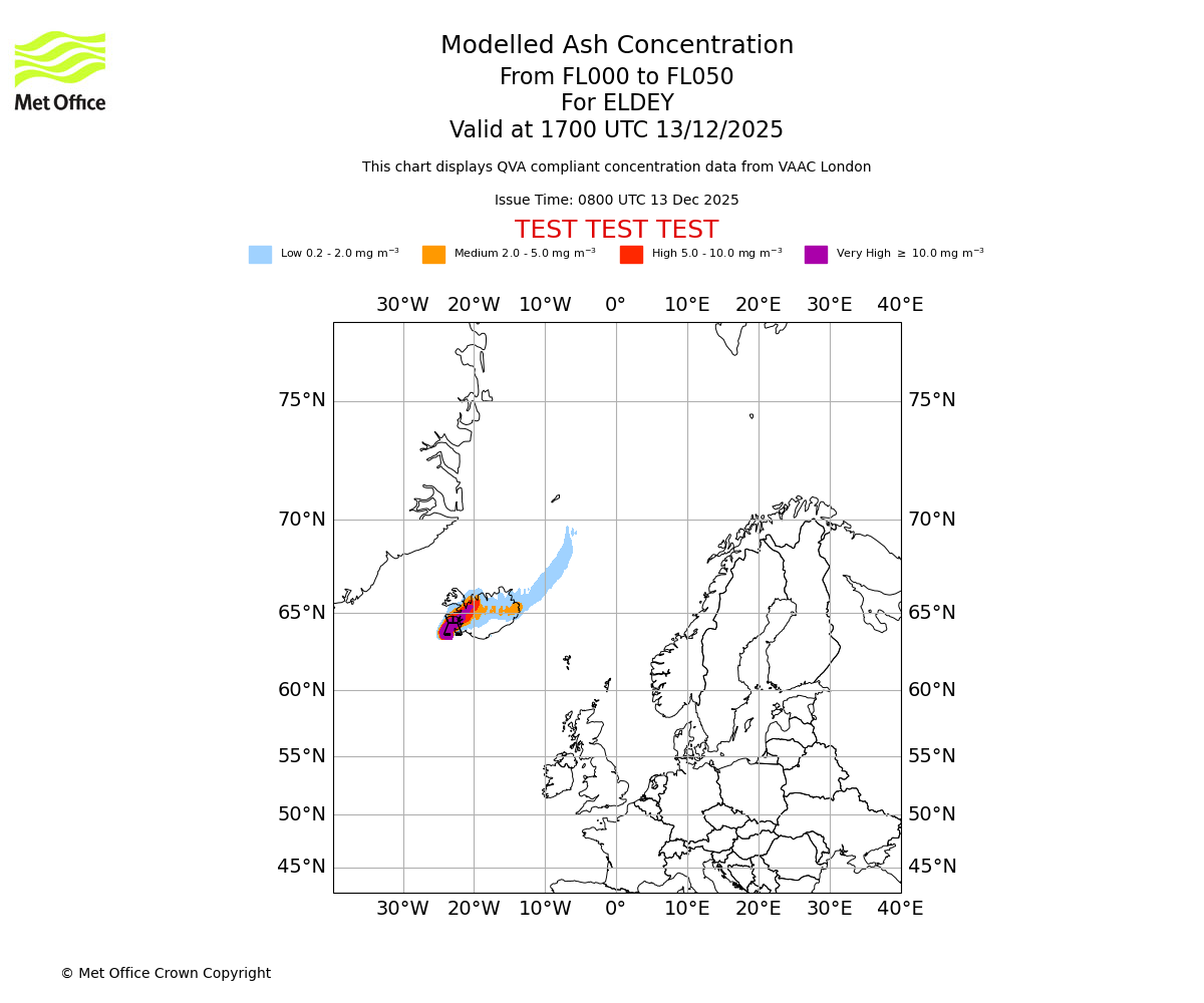 Modelled ash concentration from 000 to 200 for ELDEY. Valid at 0800 UTC 13/12/2025