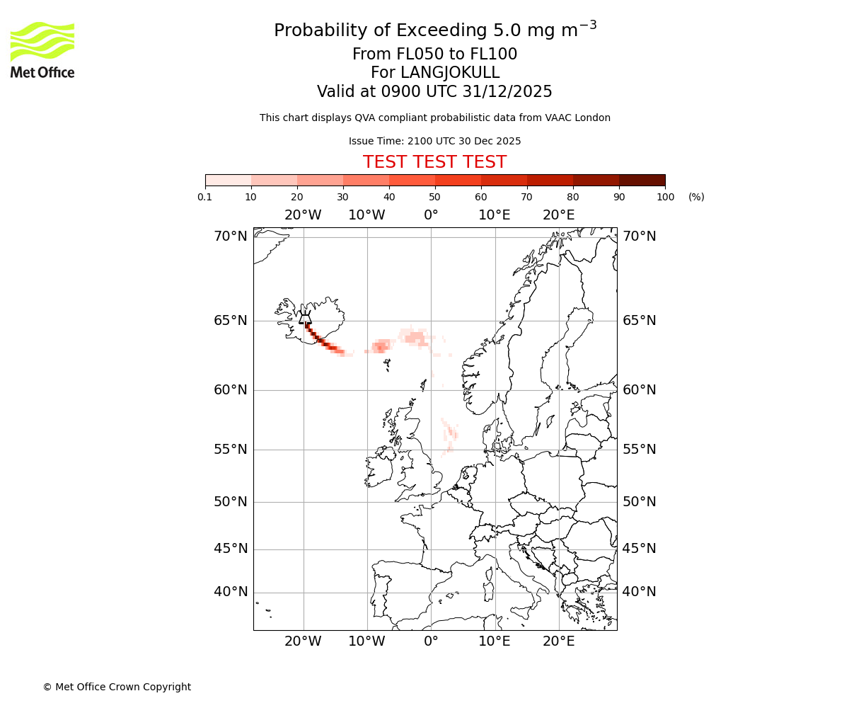 Probability of exceeding 5.0 milligrams per metre cubed. From 000 to 050 for LANGJOKULL. Valid at 0900 UTC 31/12/2025