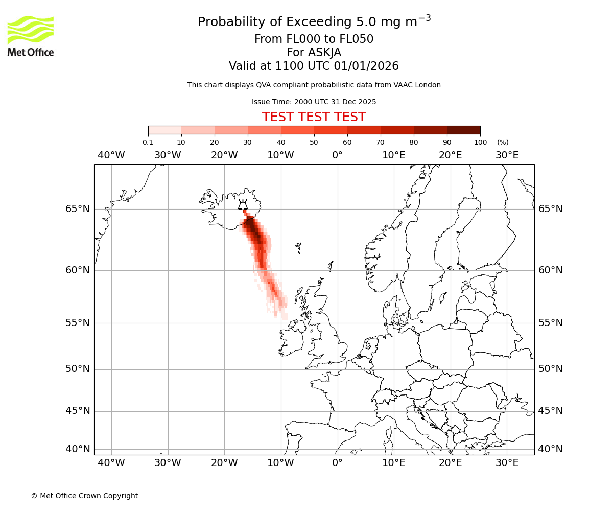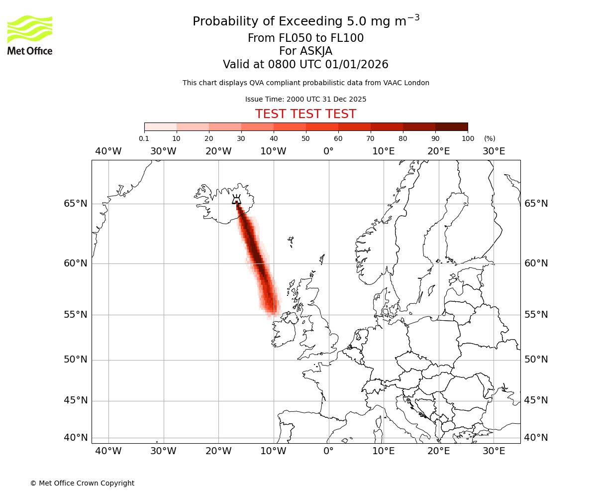 Probability of exceeding 5.0 milligrams per metre cubed. From 000 to 050 for ASKJA. Valid at 0800 UTC 01/01/2026