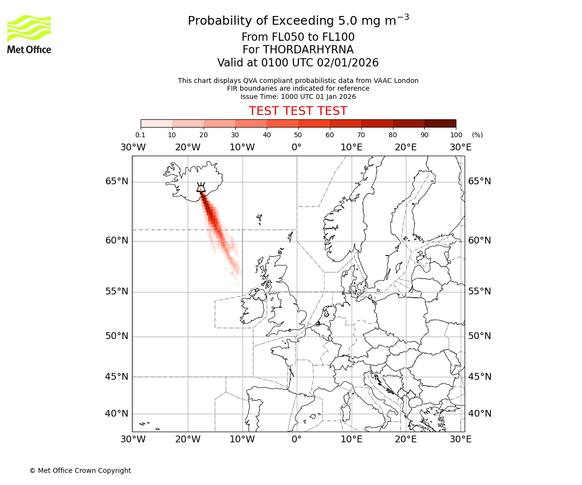 Probability of exceeding 5.0 milligrams per metre cubed. From 000 to 050 for THORDARHYRNA. Valid at 0100 UTC 02/01/2026