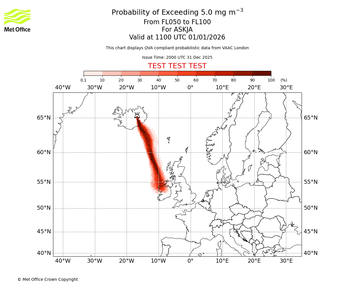 Probability of exceeding 5.0 milligrams per metre cubed. From 000 to 050 for ASKJA. Valid at 1100 UTC 01/01/2026