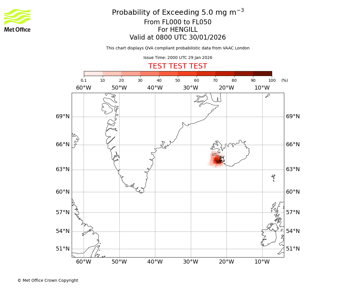 Modelled ash concentration from 000 to 050 for HENGILL. Valid at 2300 UTC 29/01/2026