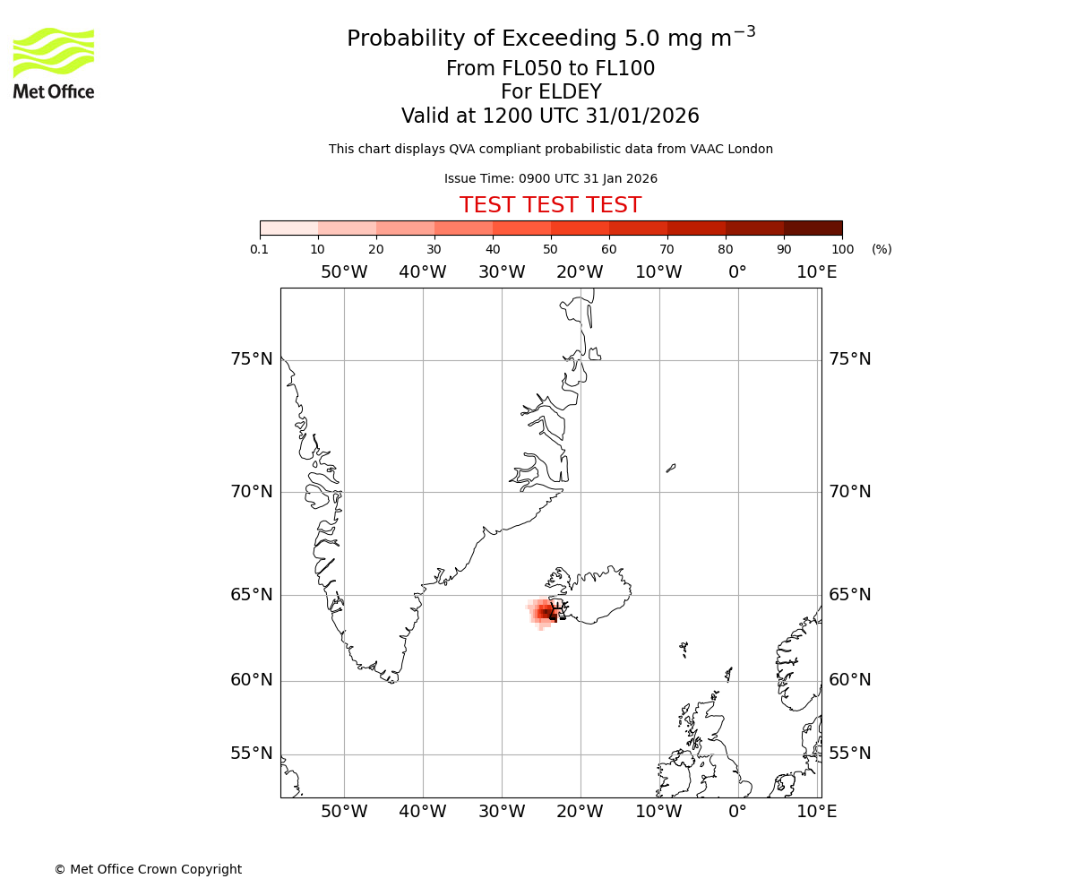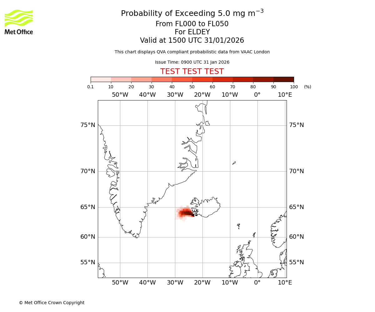 Modelled ash concentration from 000 to 050 for ELDEY. Valid at 0900 UTC 31/01/2026
