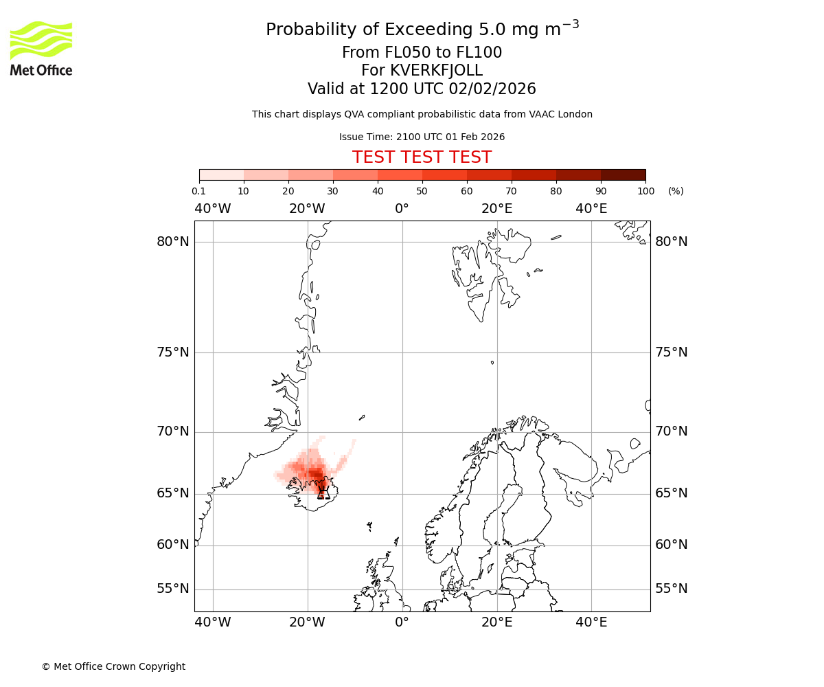Modelled ash concentration from 000 to 050 for KVERKFJOLL. Valid at 2100 UTC 01/02/2026
