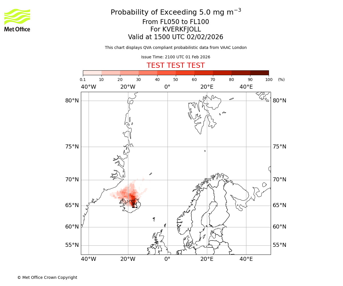 Modelled ash concentration from 000 to 050 for KVERKFJOLL. Valid at 2100 UTC 01/02/2026