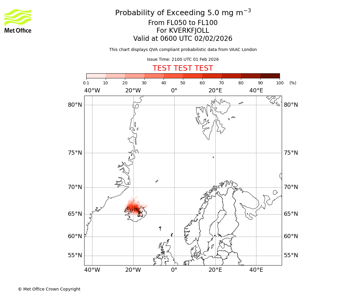 Probability of exceeding 5.0 milligrams per metre cubed. From 000 to 050 for KVERKFJOLL. Valid at 0600 UTC 02/02/2026