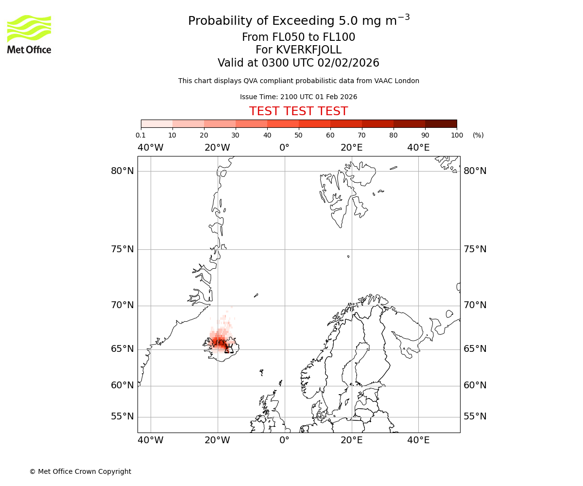Modelled ash concentration from 000 to 050 for KVERKFJOLL. Valid at 0300 UTC 02/02/2026