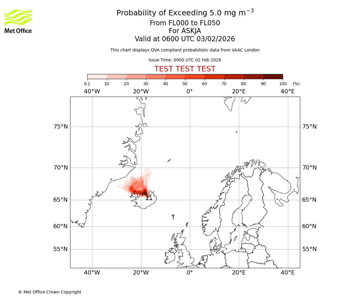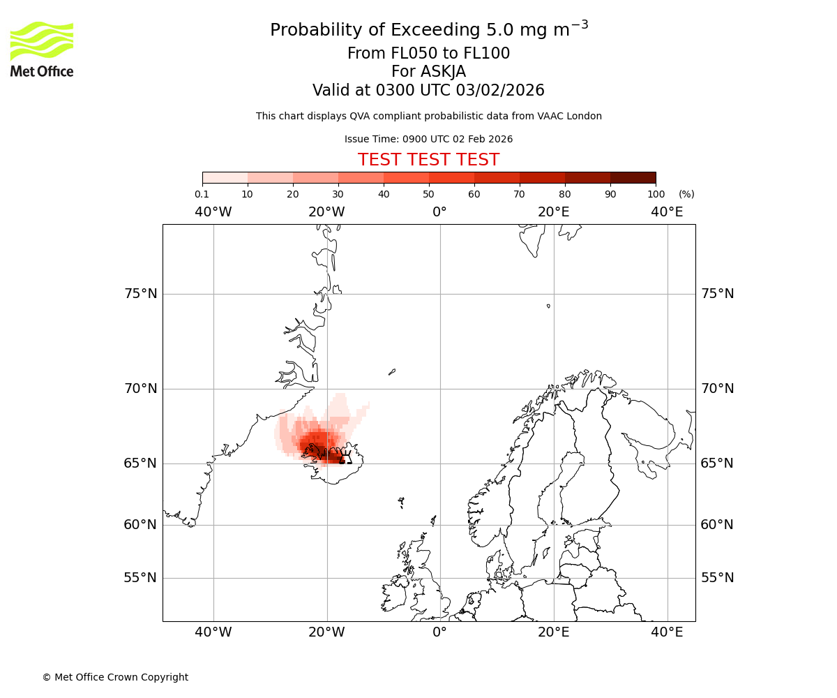 Probability of exceeding 5.0 milligrams per metre cubed. From 000 to 050 for ASKJA. Valid at 0300 UTC 03/02/2026