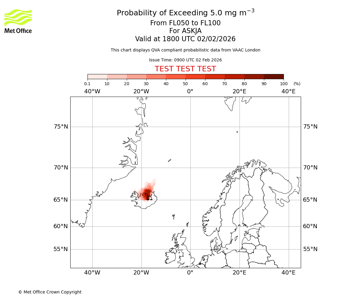 Probability of exceeding 5.0 milligrams per metre cubed. From 000 to 050 for ASKJA. Valid at 1800 UTC 02/02/2026
