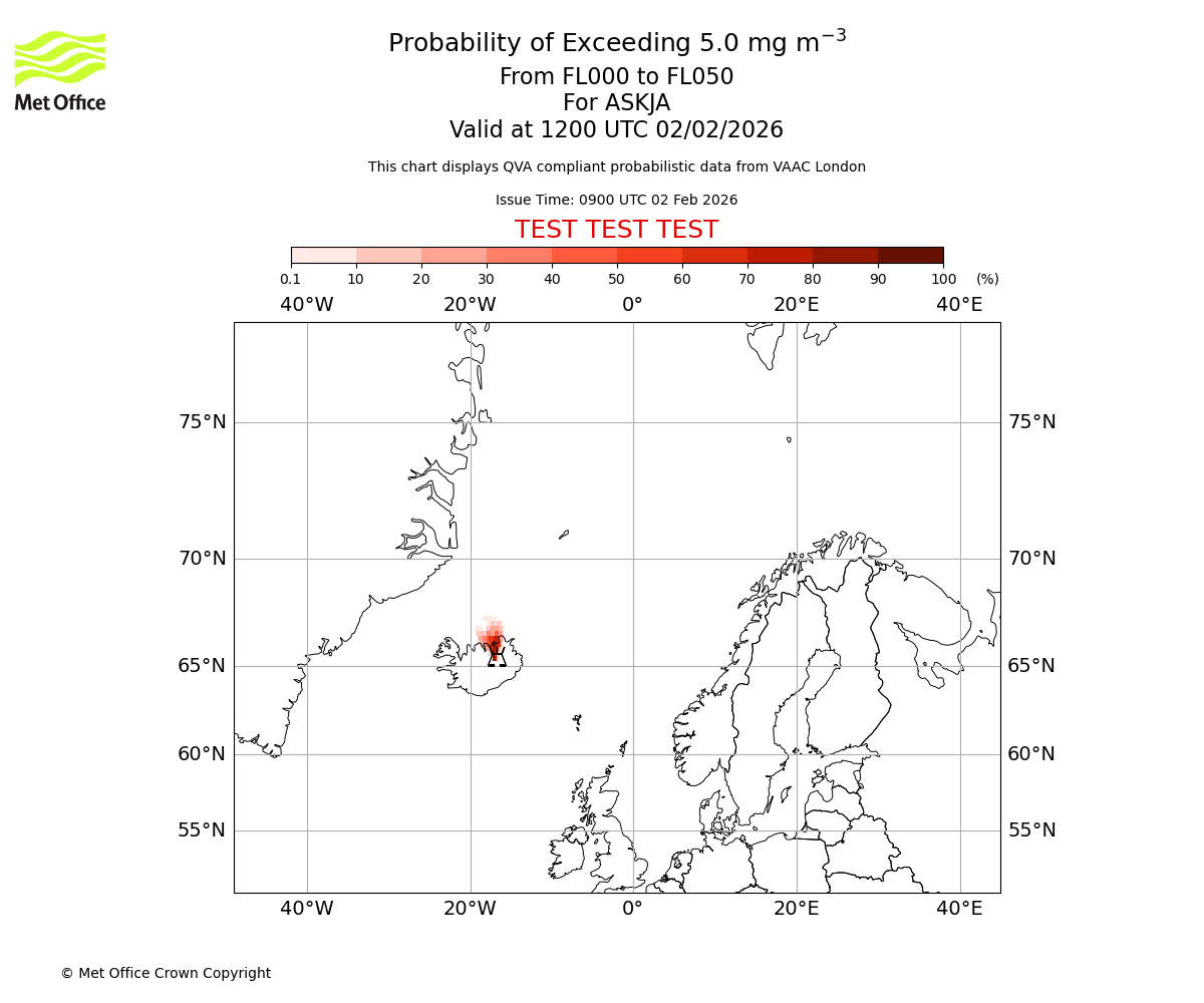 Probability of exceeding 5.0 milligrams per metre cubed. From 000 to 050 for ASKJA. Valid at 1500 UTC 02/02/2026