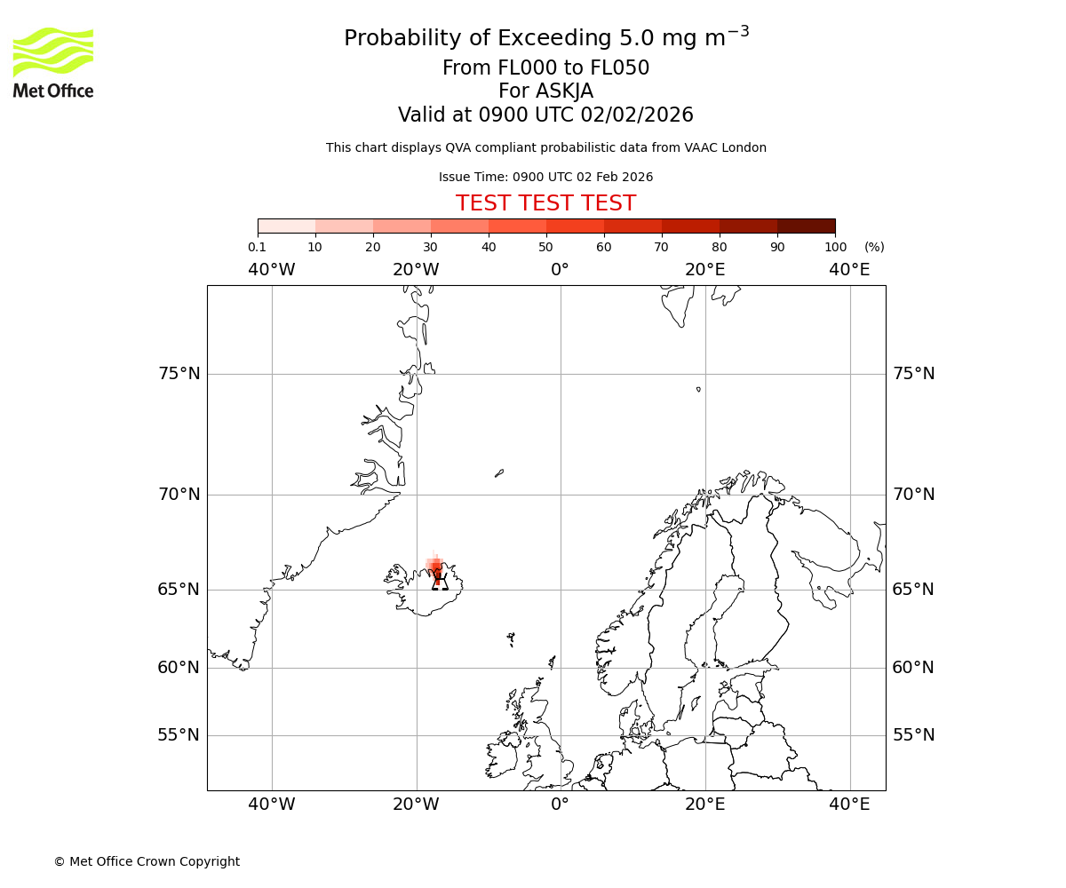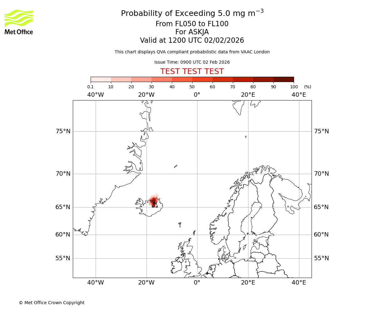 Probability of exceeding 5.0 milligrams per metre cubed. From 000 to 050 for ASKJA. Valid at 1200 UTC 02/02/2026