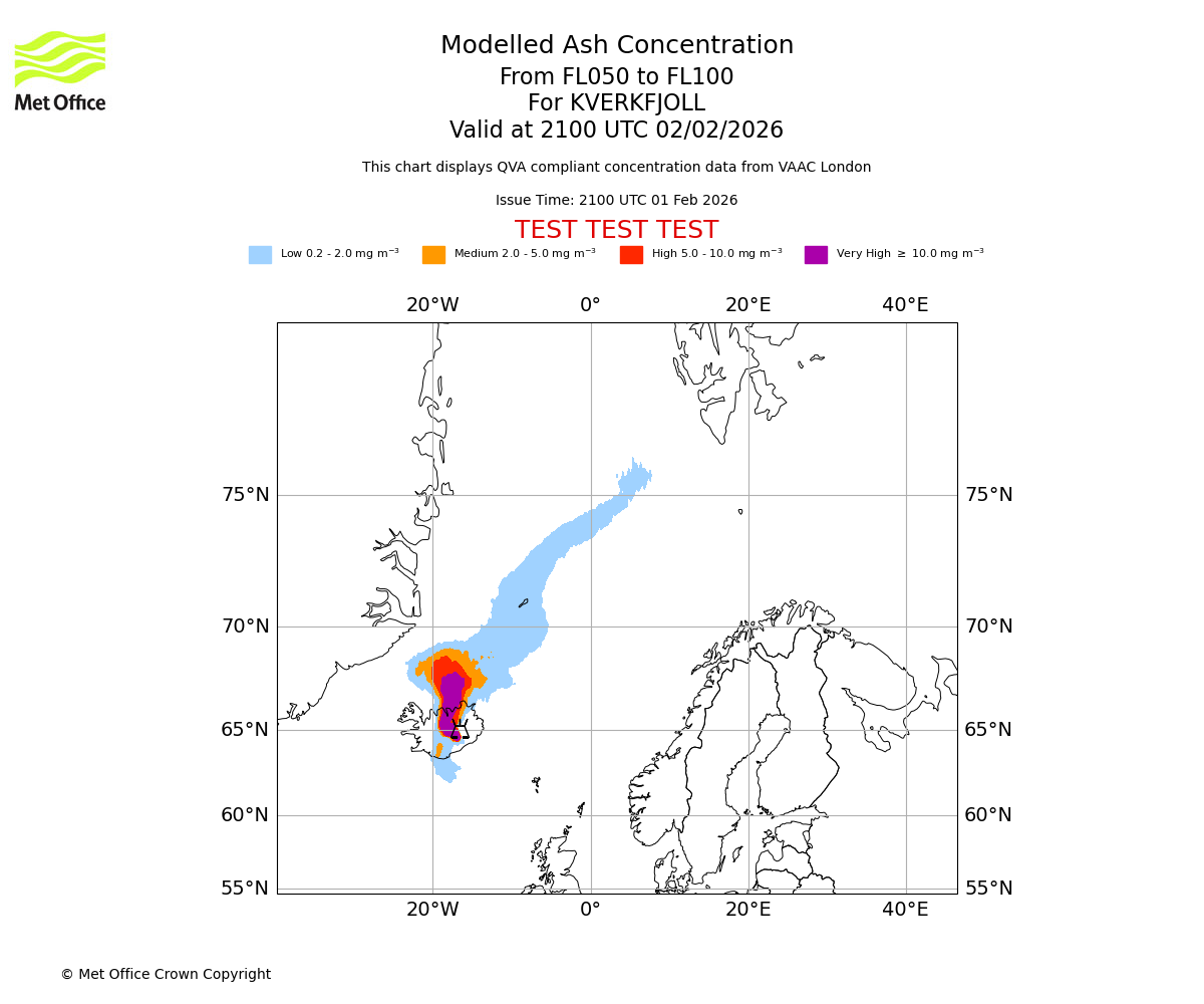 Modelled ash concentration from 000 to 050 for KVERKFJOLL. Valid at 2100 UTC 02/02/2026
