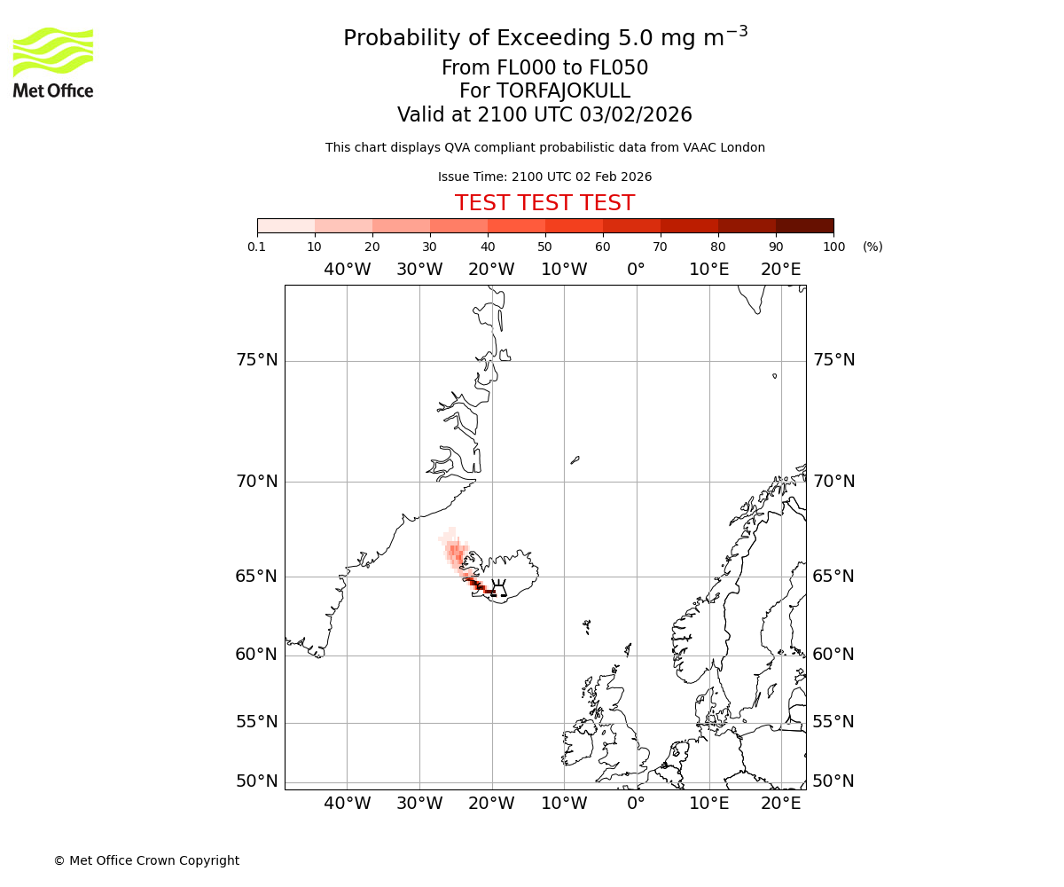 Probability of exceeding 5.0 milligrams per metre cubed. From 000 to 050 for TORFAJOKULL. Valid at 1800 UTC 03/02/2026