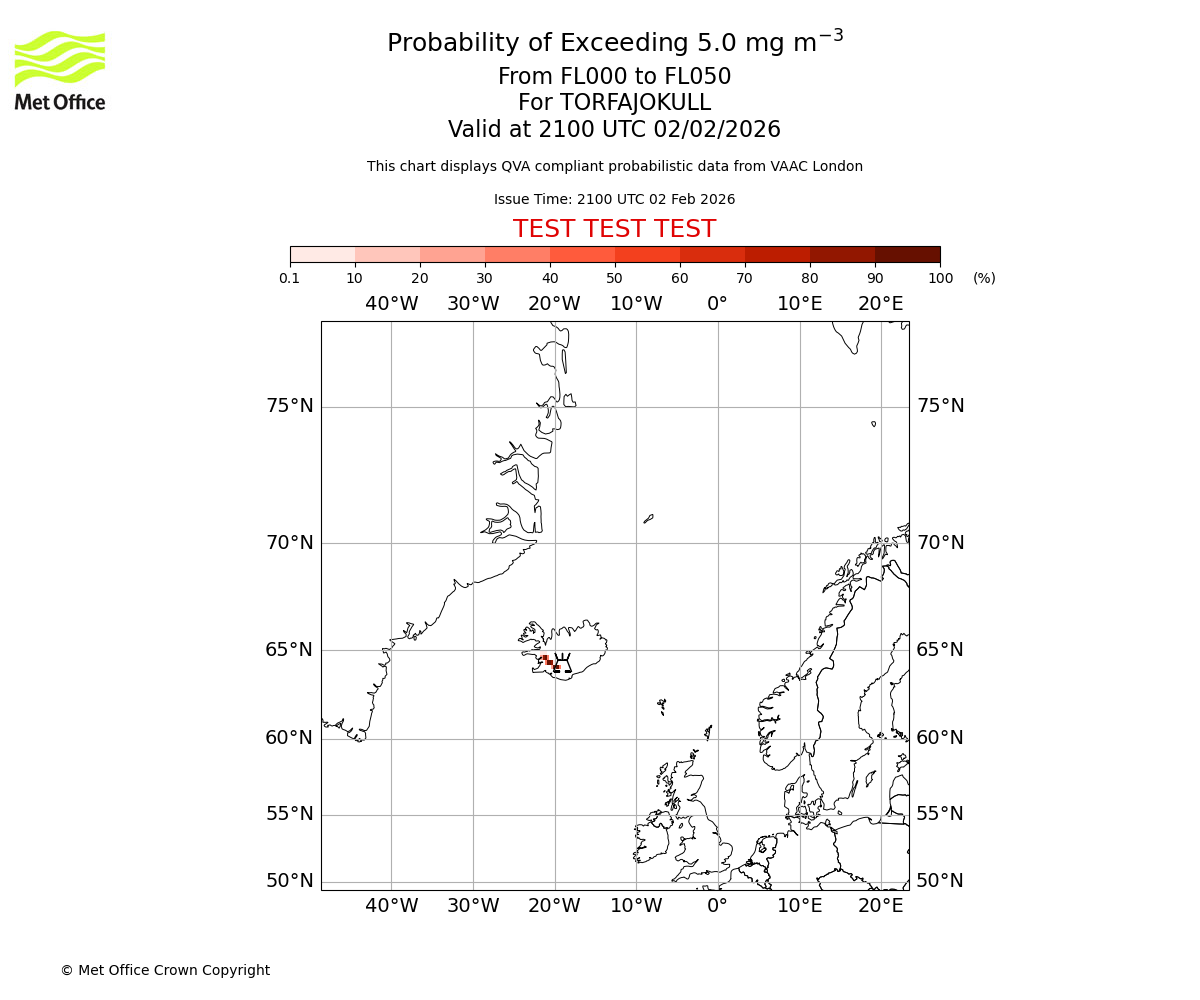 Probability of exceeding 5.0 milligrams per metre cubed. From 000 to 050 for TORFAJOKULL. Valid at 0000 UTC 03/02/2026