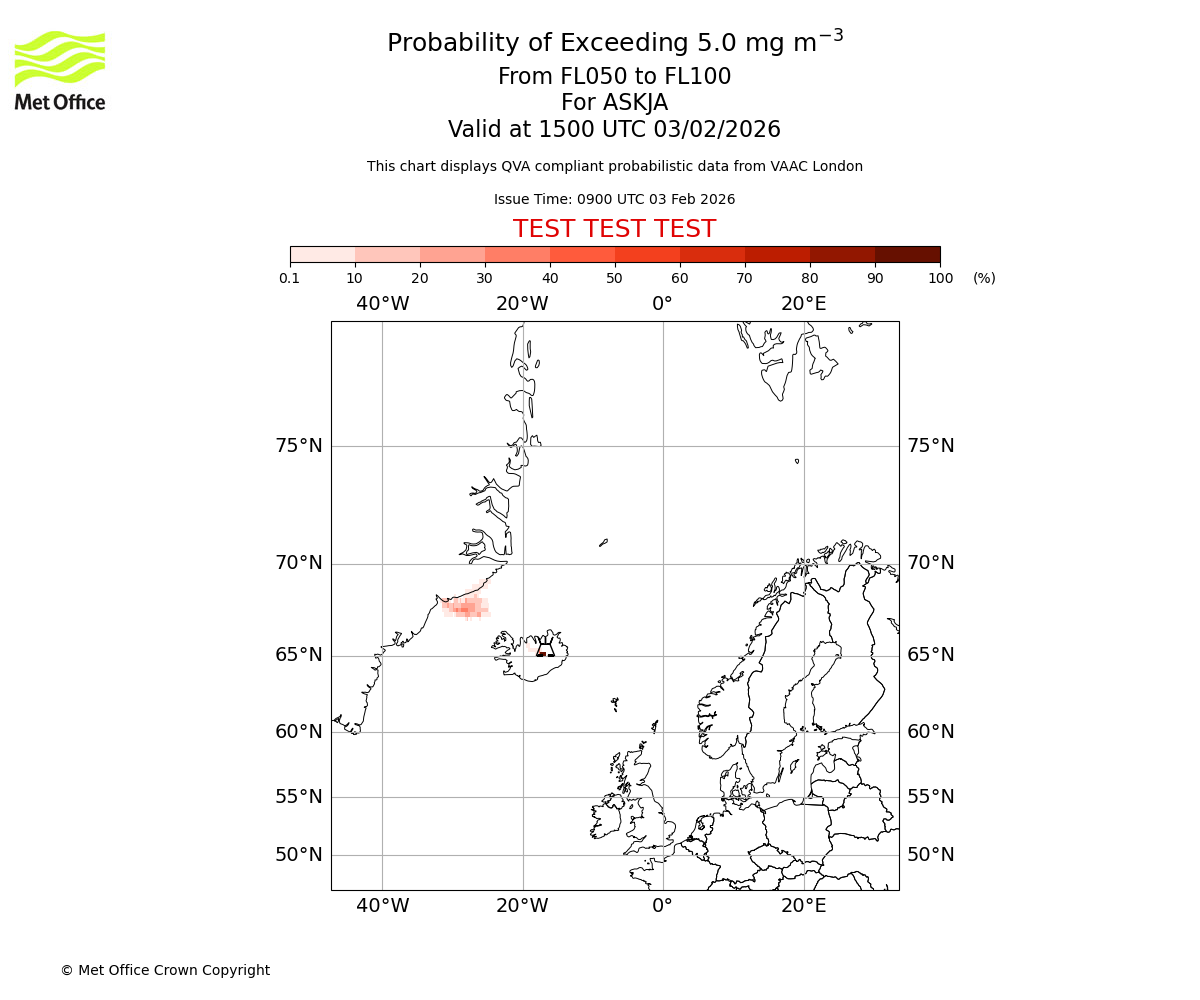 Probability of exceeding 5.0 milligrams per metre cubed. From 000 to 050 for ASKJA. Valid at 1500 UTC 03/02/2026