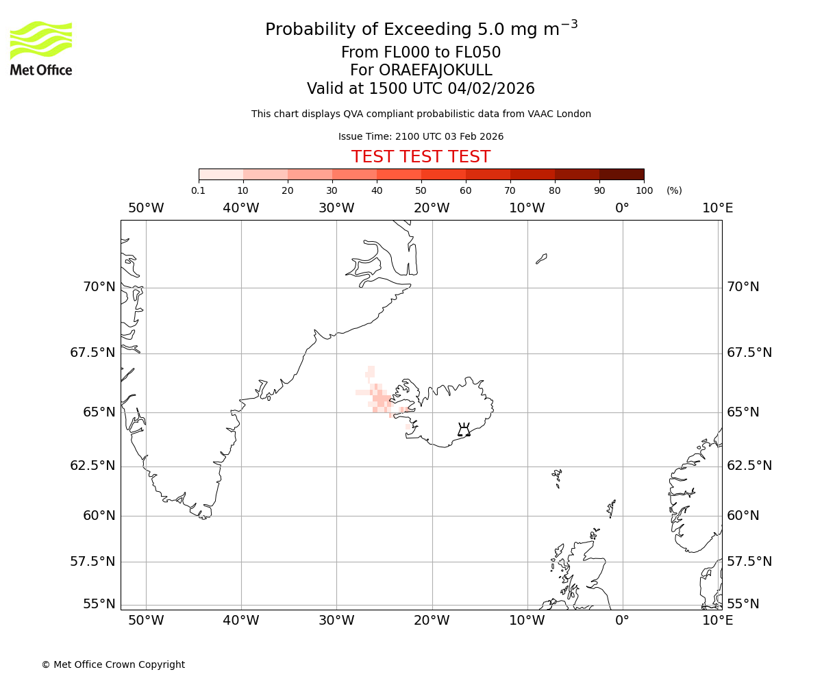 Probability of exceeding 5.0 milligrams per metre cubed. From 000 to 050 for ORAEFAJOKULL. Valid at 1200 UTC 04/02/2026