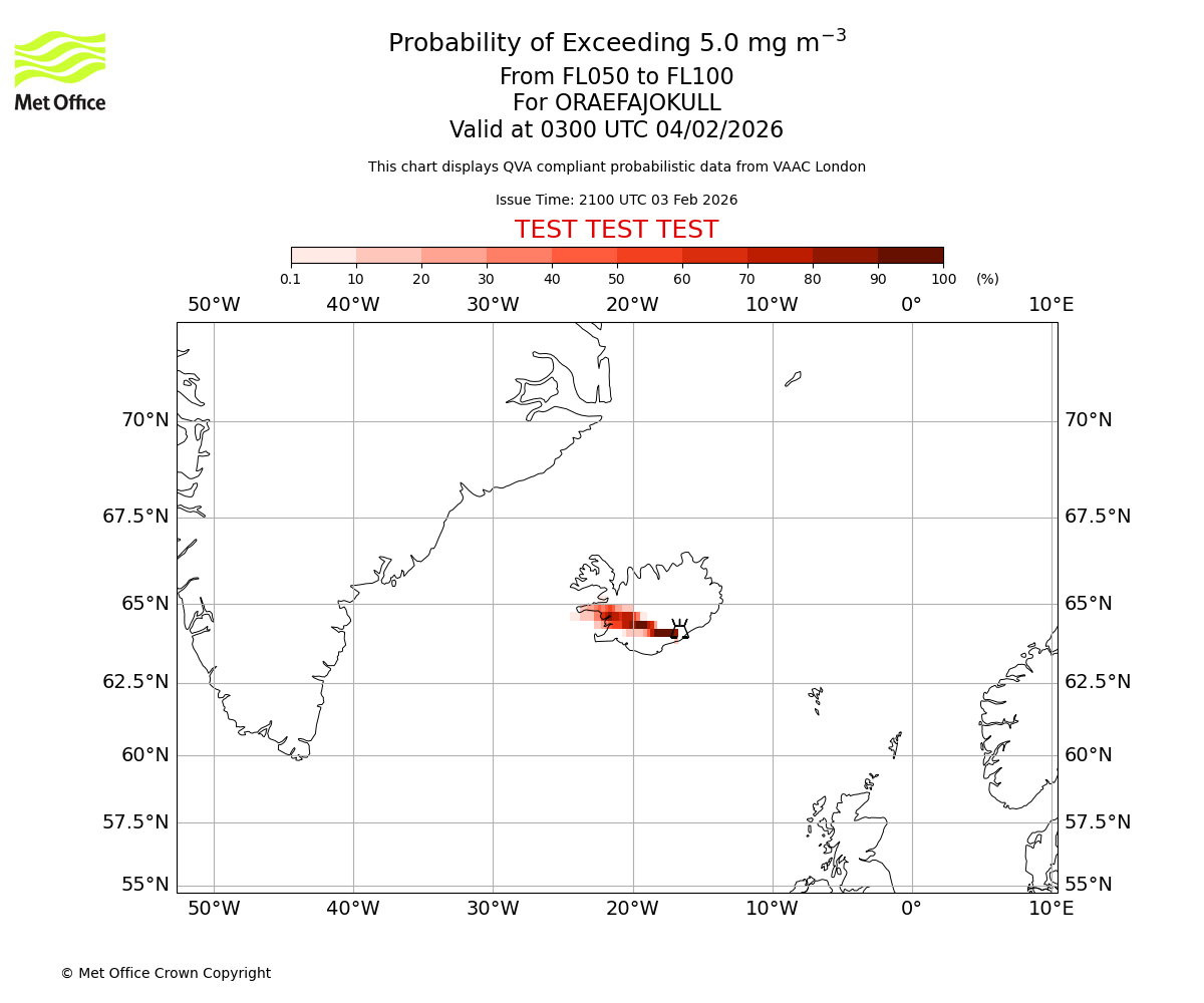 Probability of exceeding 5.0 milligrams per metre cubed. From 000 to 050 for ORAEFAJOKULL. Valid at 0300 UTC 04/02/2026