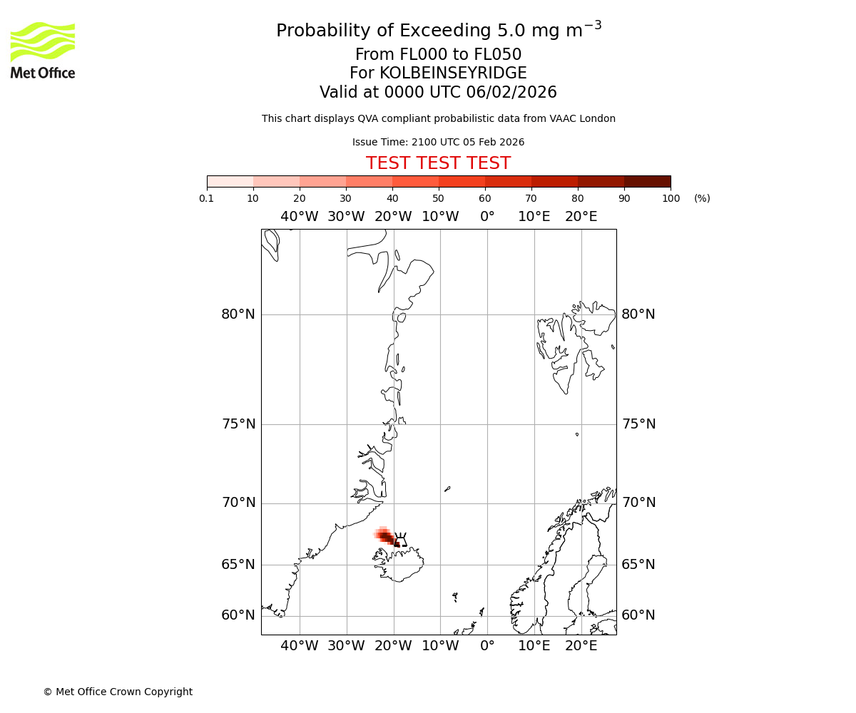 Probability of exceeding 5.0 milligrams per metre cubed. From 000 to 050 for KOLBEINSEYRIDGE. Valid at 2100 UTC 05/02/2026