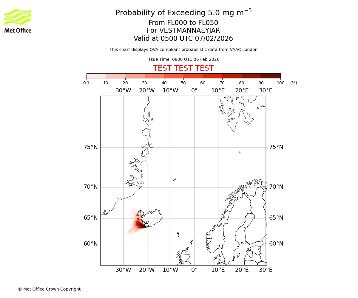 Probability of exceeding 5.0 milligrams per metre cubed. From 000 to 050 for VESTMANNAEYJAR. Valid at 0200 UTC 07/02/2026