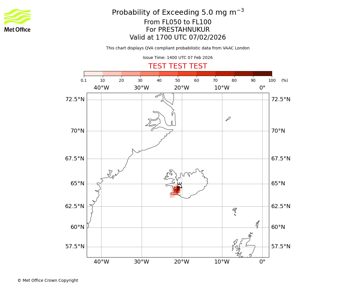 Modelled ash concentration from 000 to 050 for PRESTAHNUKUR. Valid at 1400 UTC 07/02/2026
