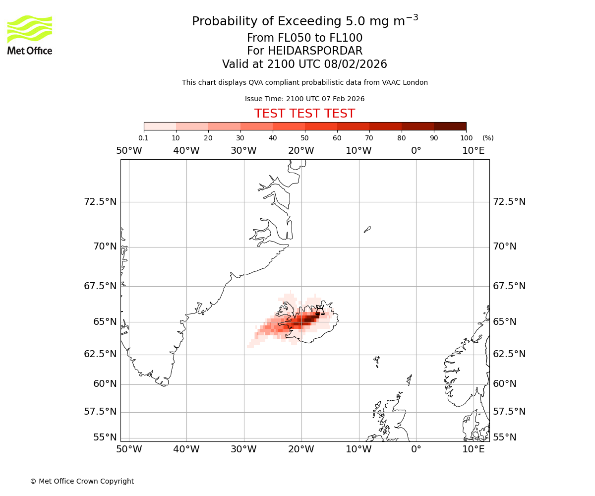 Probability of exceeding 5.0 milligrams per metre cubed. From 000 to 050 for HEIDARSPORDAR. Valid at 2100 UTC 08/02/2026
