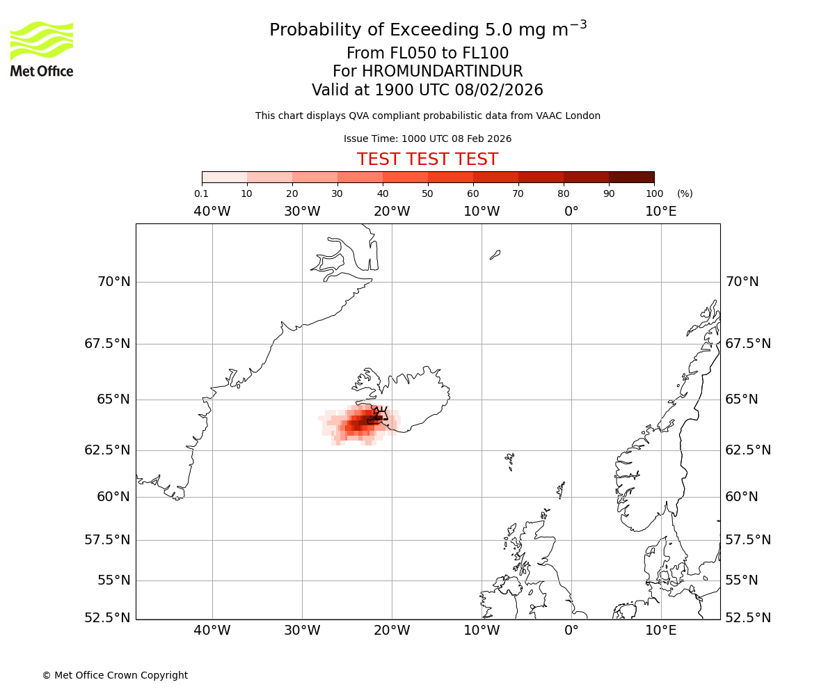 Modelled ash concentration from 000 to 050 for HROMUNDARTINDUR. Valid at 1000 UTC 08/02/2026