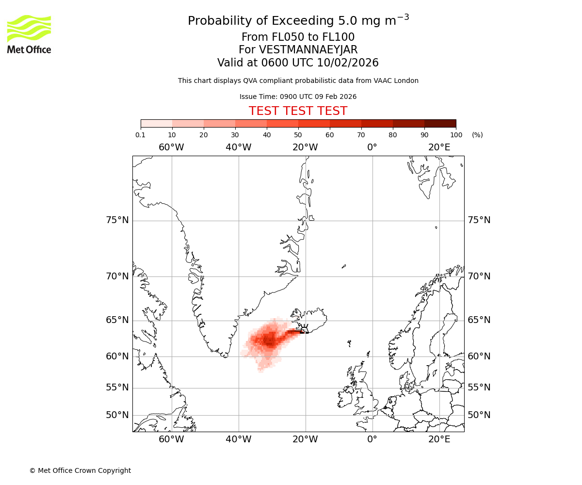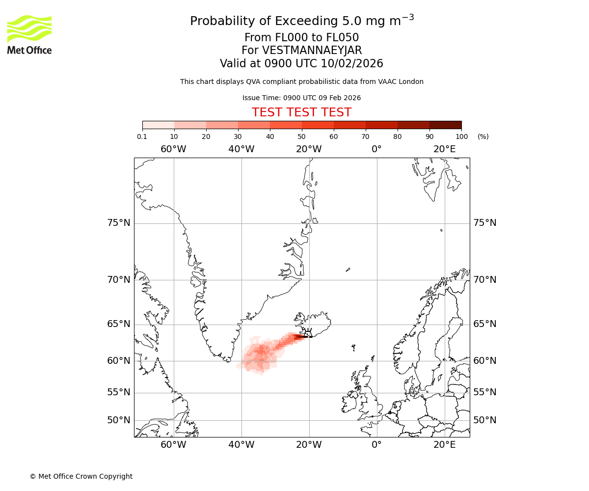 Probability of exceeding 5.0 milligrams per metre cubed. From 000 to 050 for VESTMANNAEYJAR. Valid at 0600 UTC 10/02/2026