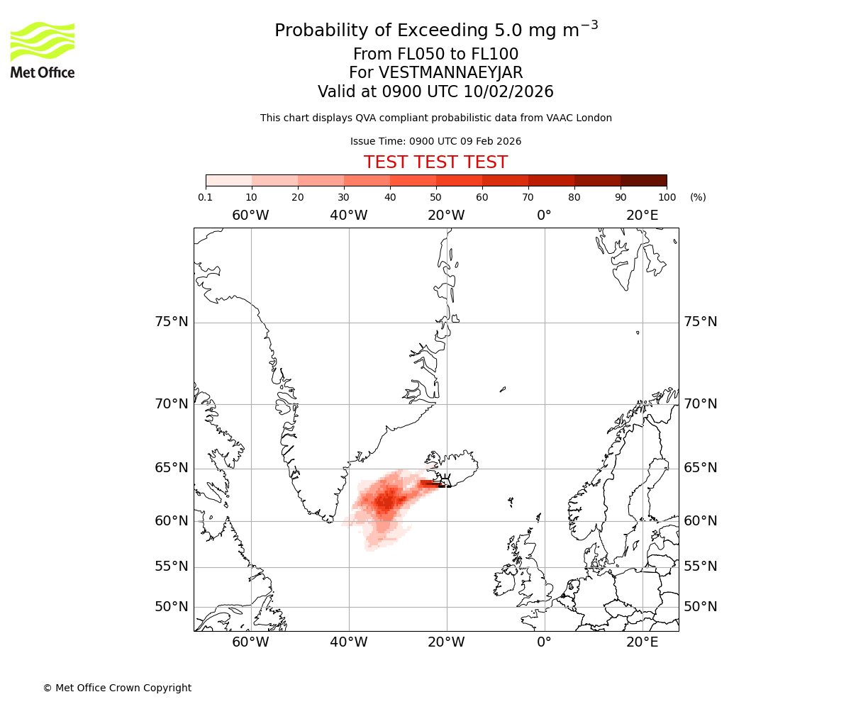 Probability of exceeding 5.0 milligrams per metre cubed. From 000 to 050 for VESTMANNAEYJAR. Valid at 0900 UTC 10/02/2026