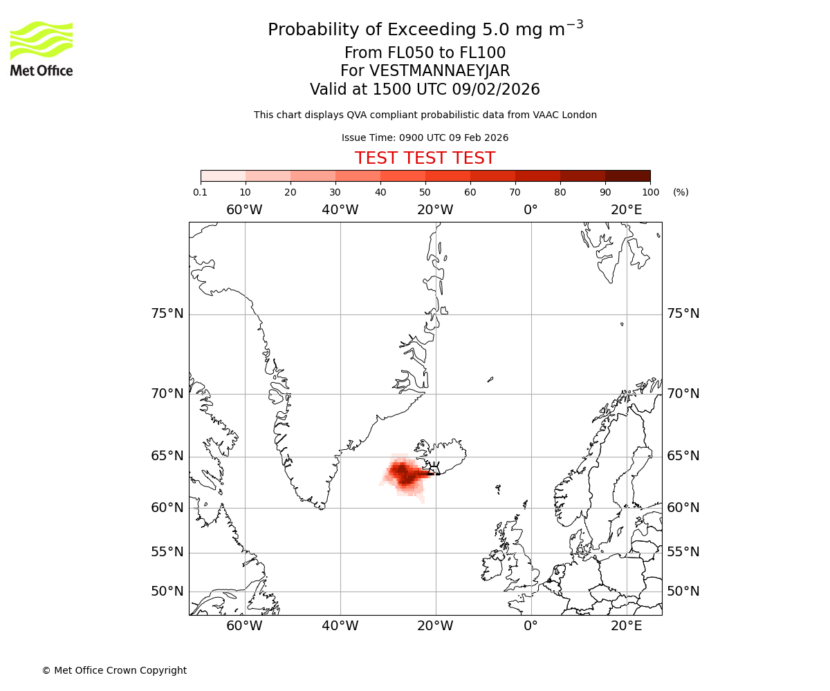 Probability of exceeding 5.0 milligrams per metre cubed. From 000 to 050 for VESTMANNAEYJAR. Valid at 1500 UTC 09/02/2026