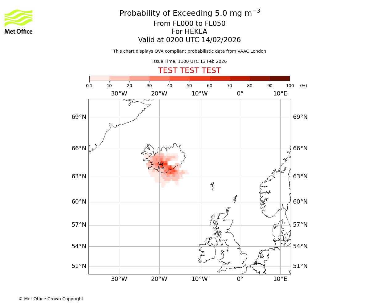 Modelled ash concentration from 000 to 050 for HEKLA. Valid at 1100 UTC 13/02/2026