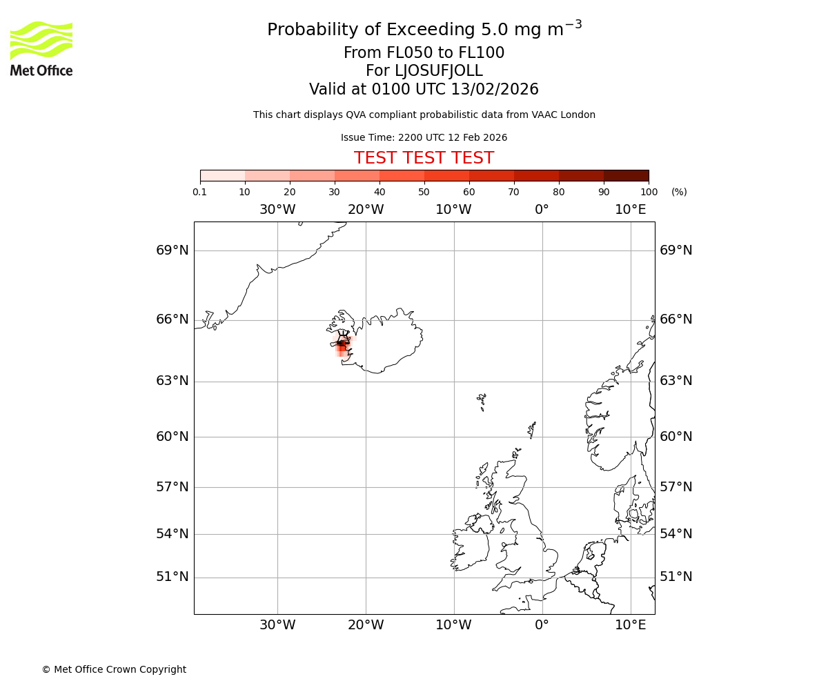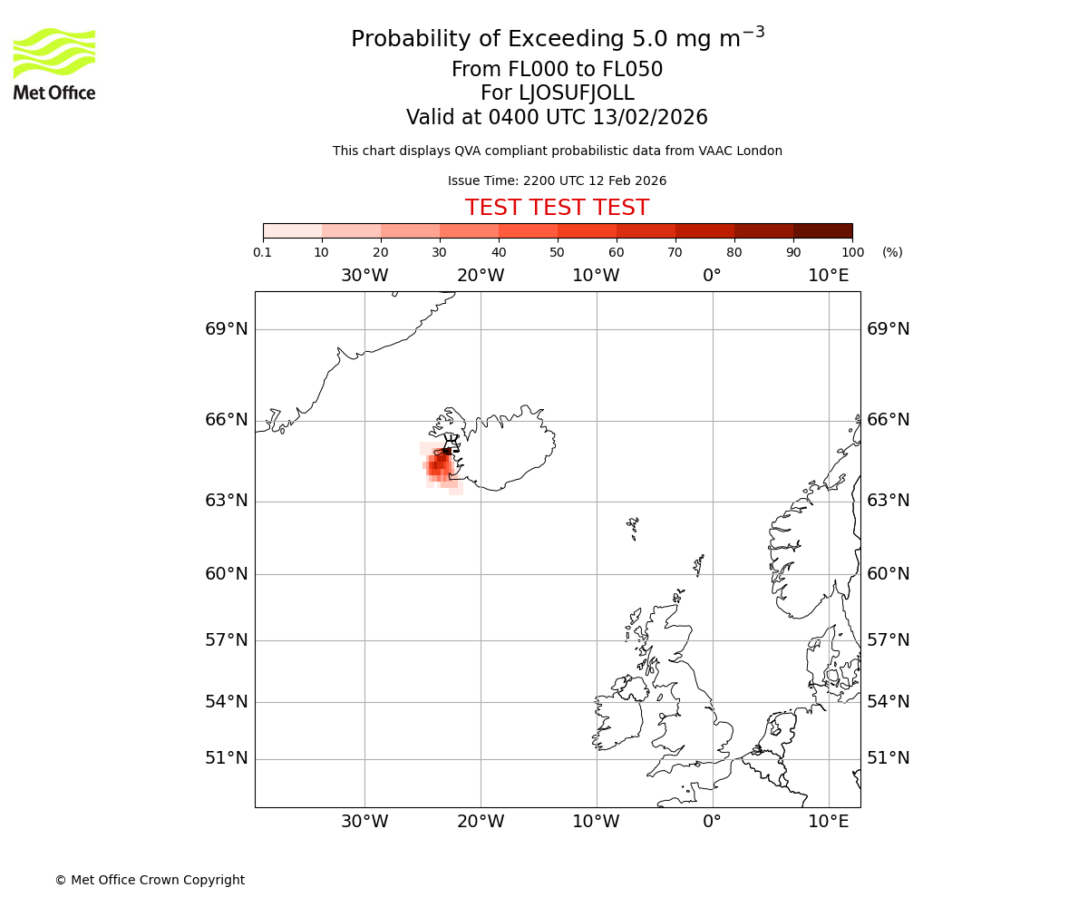 Modelled ash concentration from 000 to 050 for LJOSUFJOLL. Valid at 2200 UTC 12/02/2026
