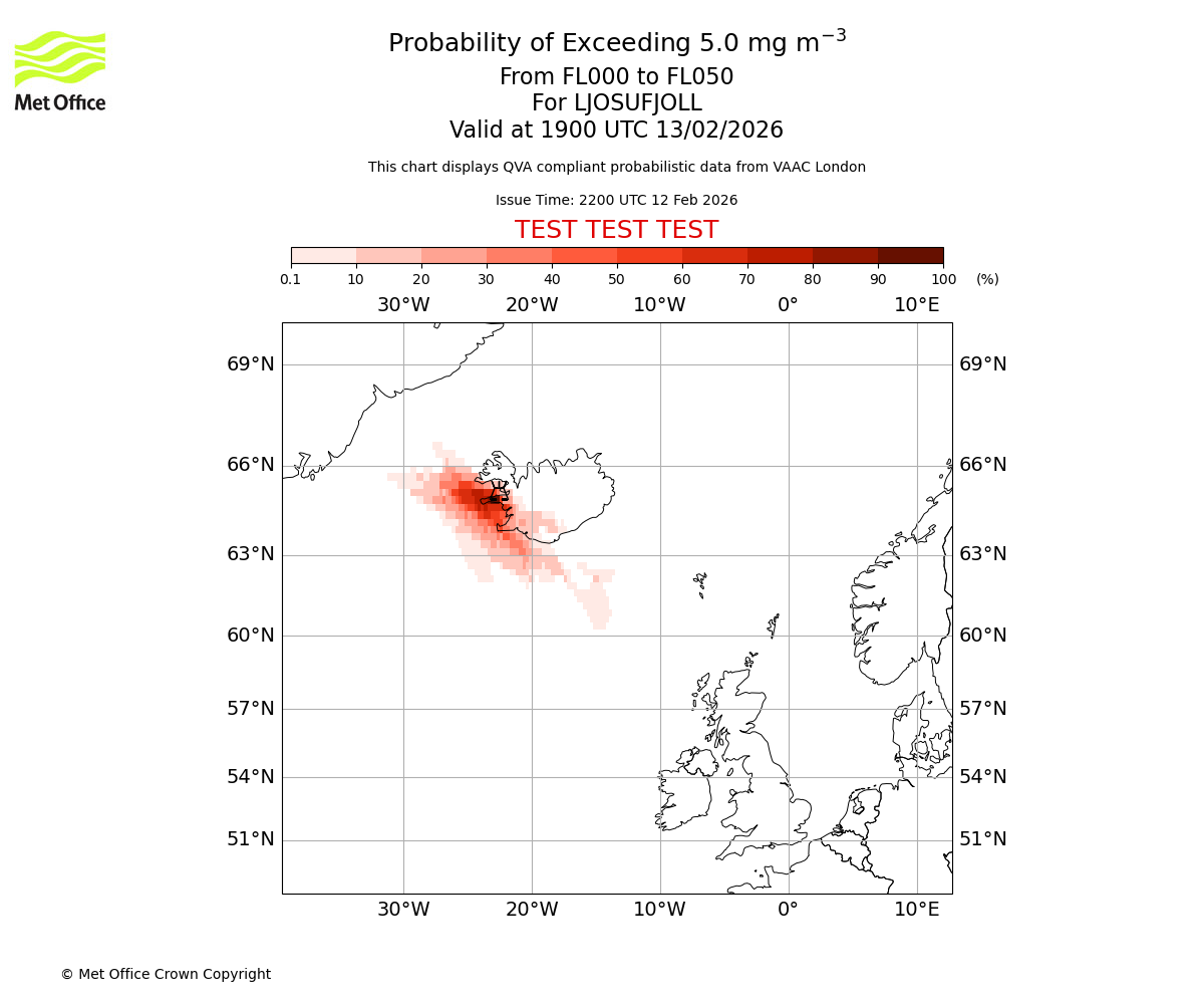 Modelled ash concentration from 000 to 050 for LJOSUFJOLL. Valid at 2200 UTC 12/02/2026