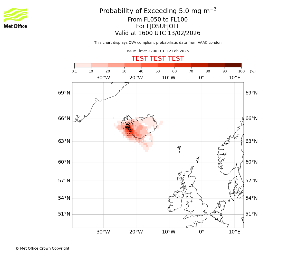 Quantitative Volcanic Ash charts (QVA) are produced in accordance with International Civil Aviation Organization (ICAO) Annex 3 requirements and are provided as well as the London Volcanic Ash Advisory Graphics (VAG) and Advisories (VAA). The lowest QVA threshold (0.2 mg/m³) matches to the areas depicted in the VAA and VAG. Both expected ash concentration and probabilistic forecast information is provided in the chart viewer below for eruptions occurring in the London Volcanic Ash Advisory Centre (VAAC) area of responsibility.