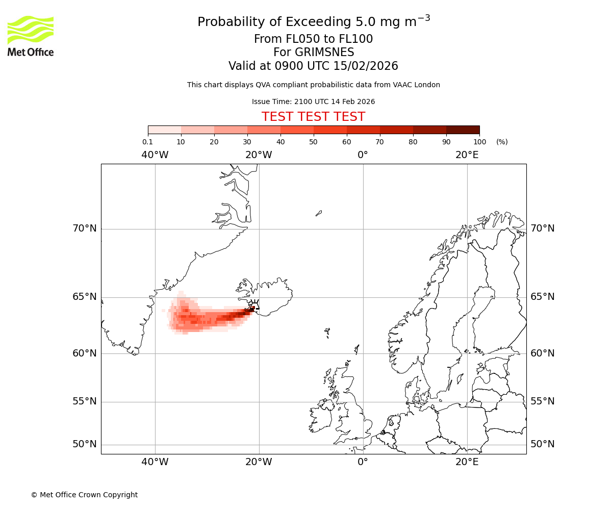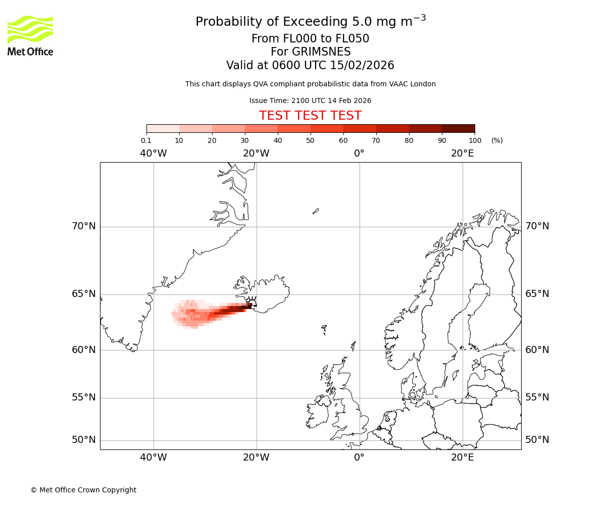 Modelled ash concentration from 000 to 050 for GRIMSNES. Valid at 2100 UTC 14/02/2026