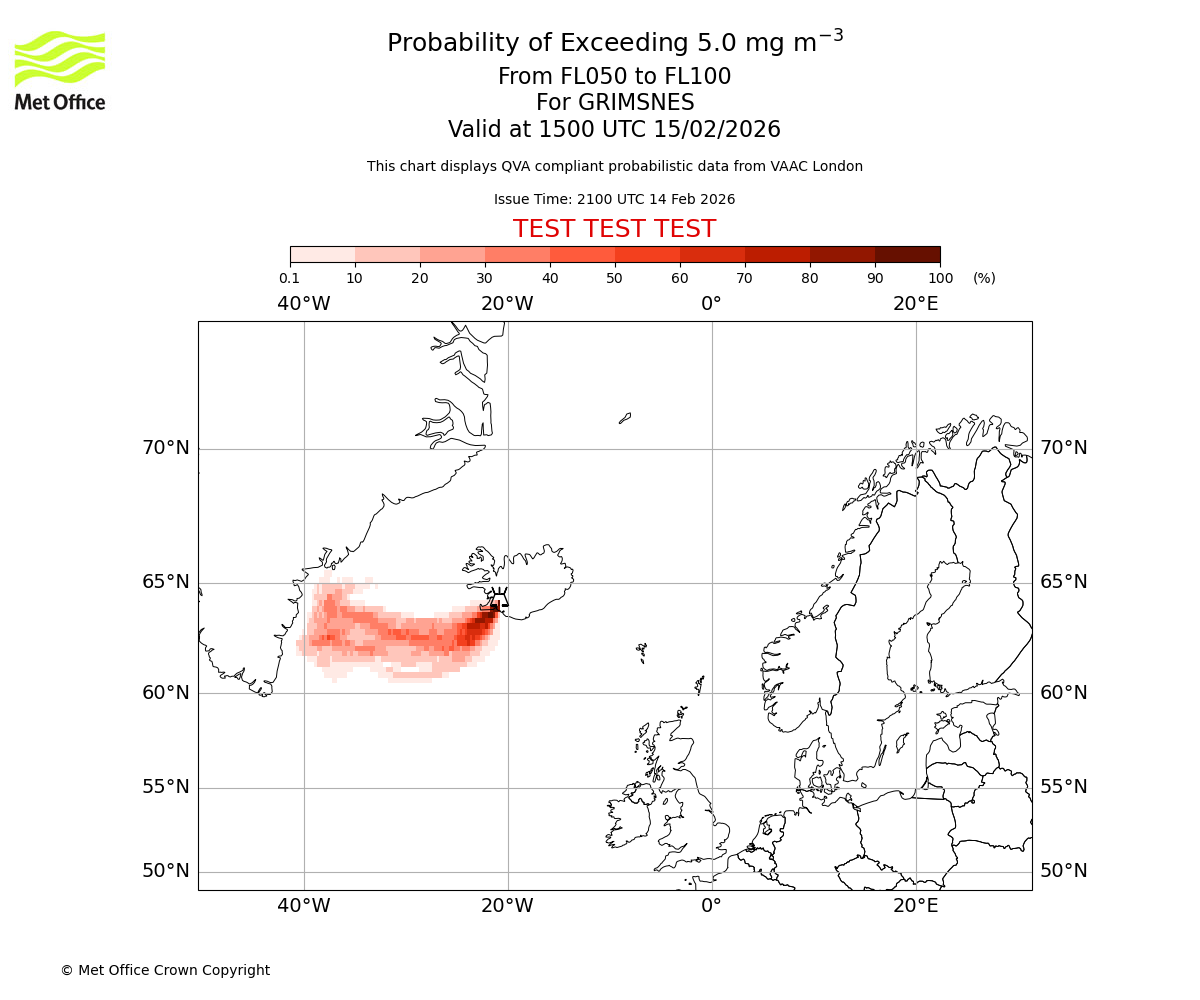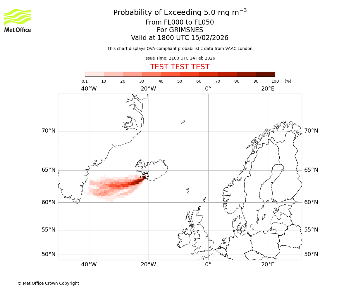 Modelled ash concentration from 000 to 050 for GRIMSNES. Valid at 2100 UTC 14/02/2026