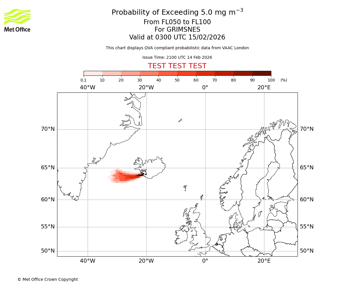 Modelled ash concentration from 000 to 050 for GRIMSNES. Valid at 2100 UTC 14/02/2026