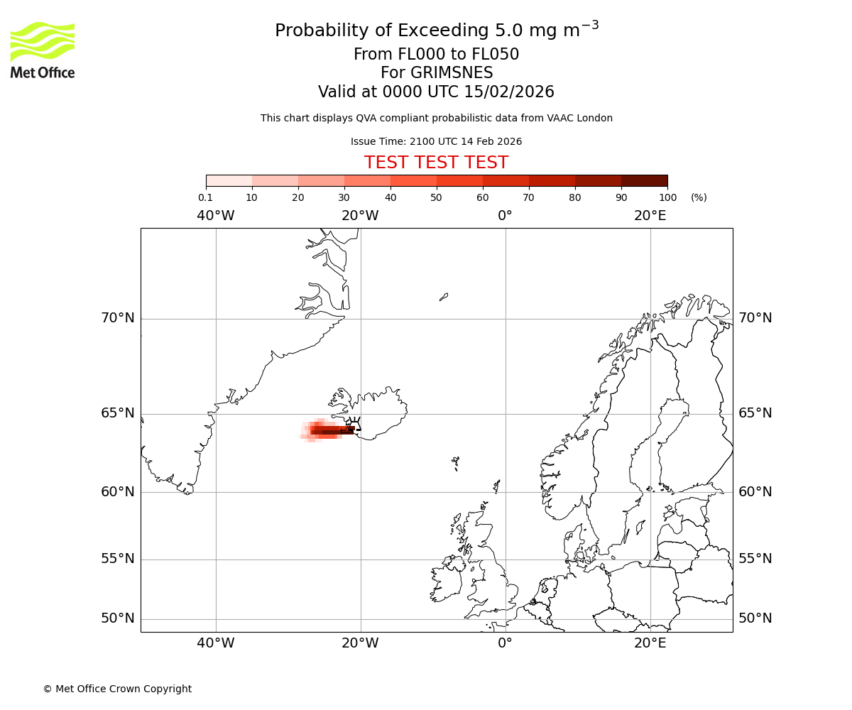 Probability of exceeding 5.0 milligrams per metre cubed. From 000 to 050 for GRIMSNES. Valid at 2100 UTC 14/02/2026