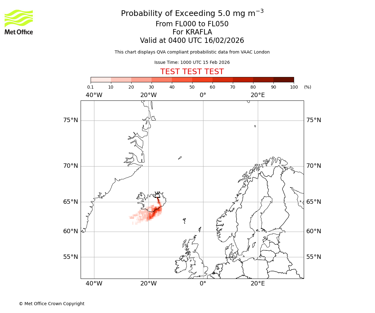 Probability of exceeding 5.0 milligrams per metre cubed. From 000 to 050 for KRAFLA. Valid at 0100 UTC 16/02/2026
