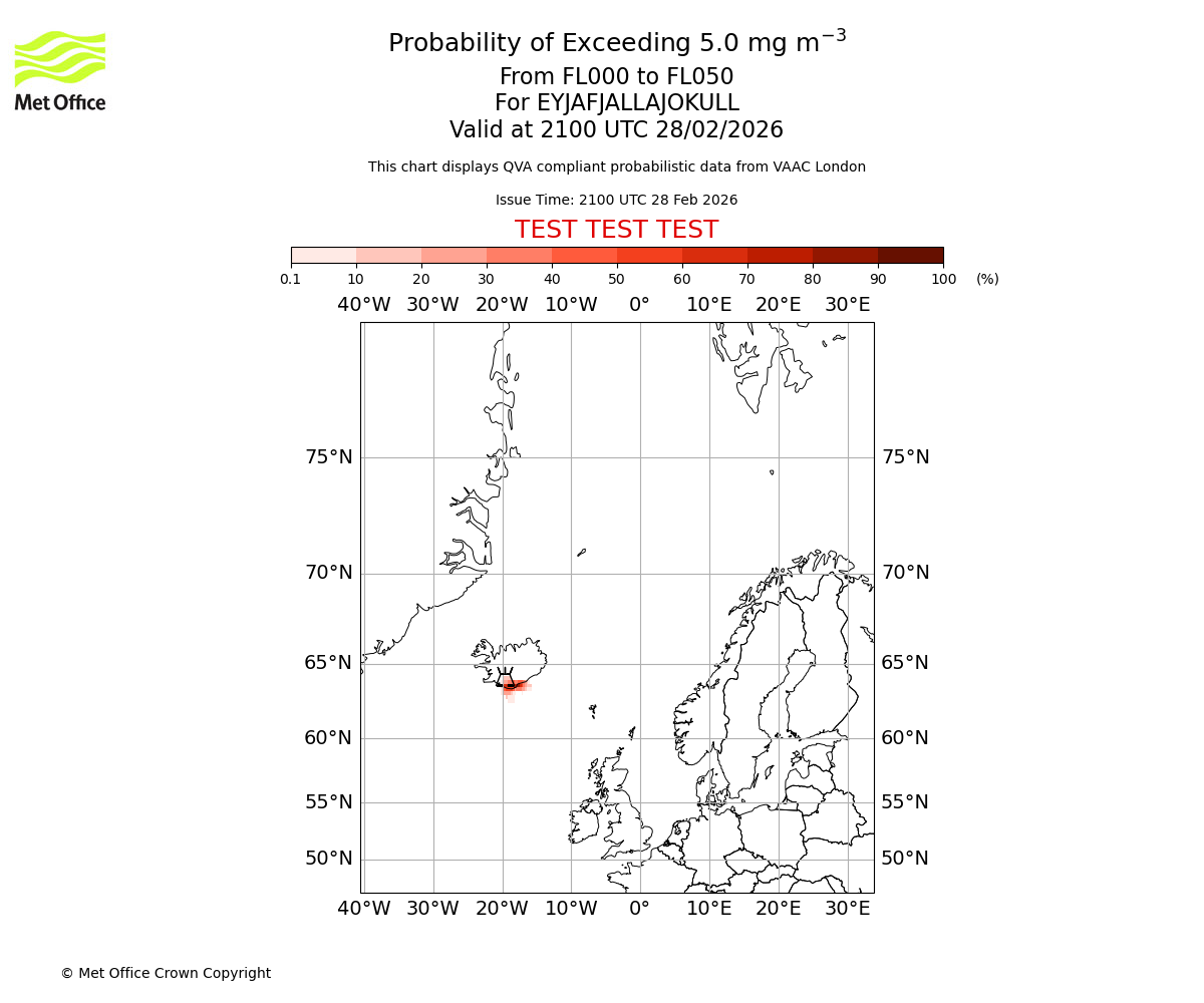 Modelled ash concentration from 000 to 200 for EYJAFJALLAJOKULL. Valid at 2100 UTC 28/02/2026
